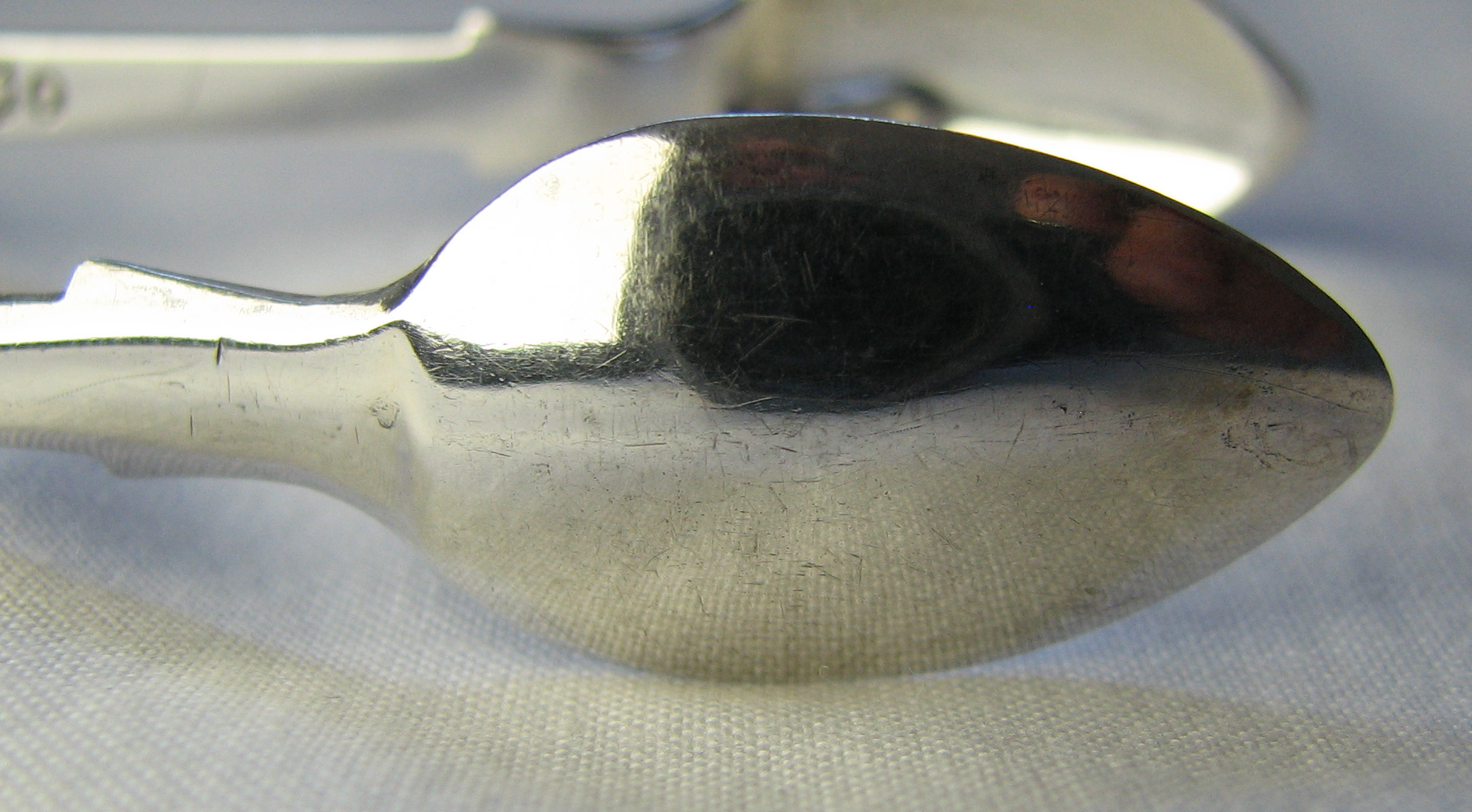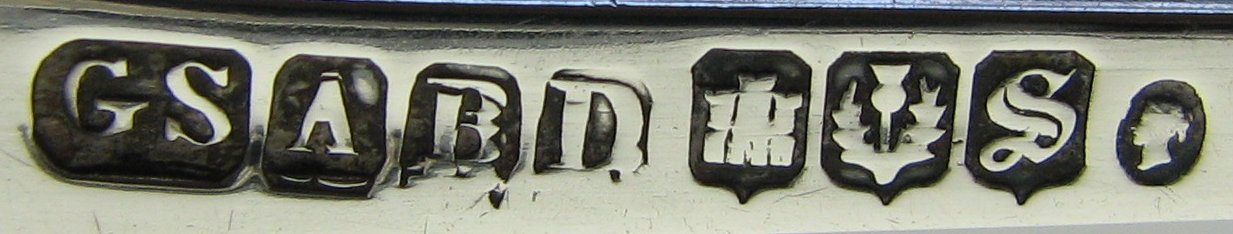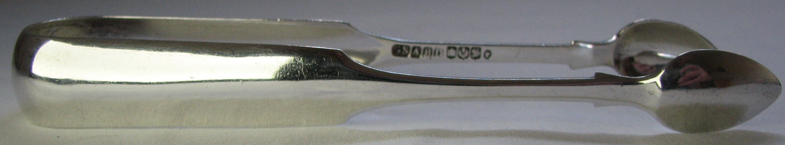 This pair of tongs is in the standard Scottish fiddle pattern. With the Scottish fiddle pattern, the arms tend to be concave and the top part of the arm is longer than that of English fiddle pattern, As with many other Scottish sugar tongs, they are somewhat larger than similar English work, being well over 6 inches long and weighing a hefty 49 grams. The tongs have full Aberdeen marks alongside the Edinburgh hallmarks for 1849/50, with Queen Victoria's bust as the duty mark. George Sangster is recorded as being active from 1839 to 1881. Click on any picture to enlarge |