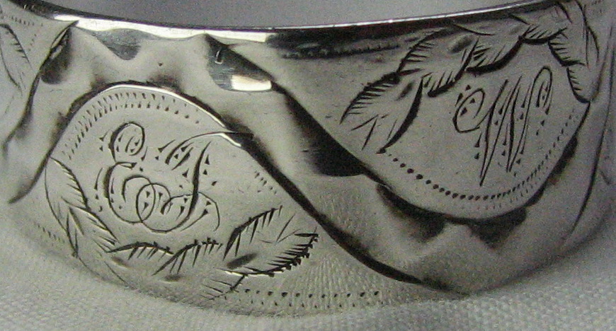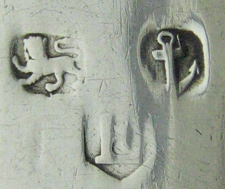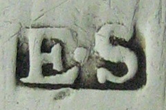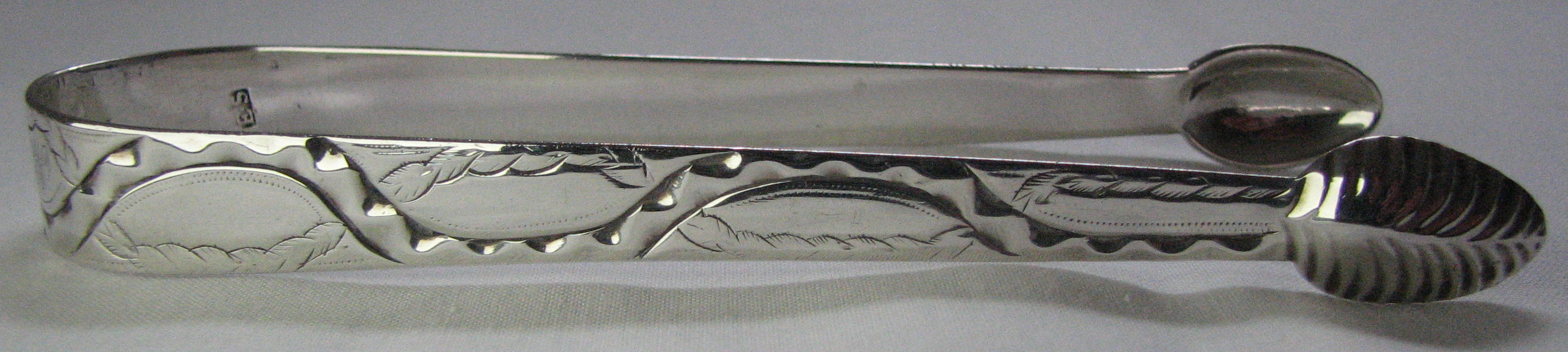 These are a beautiful pair of early Birmingham sugar tongs. Even though the date letter is a little worn, it can be seen that it is a "E" for 1777/78. This makes the tongs important as we can see that they are made in the "bow" style, from a single piece of silver, rather than being cast or made in three parts. This allows us to be certain that in Birmingham at least, the bow style tongs were being made in 1777. Notice also that the two cast pairs made by Edward Sawyer that are featured on this web-site, are dated either side of this so these tongs were clearly being made at the same time as cast tongs. These tongs are also blessed with a lovely monogram, carefully engraved into the pattern.