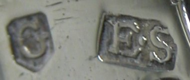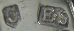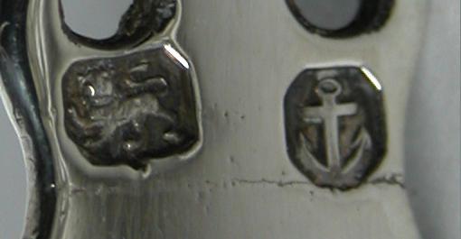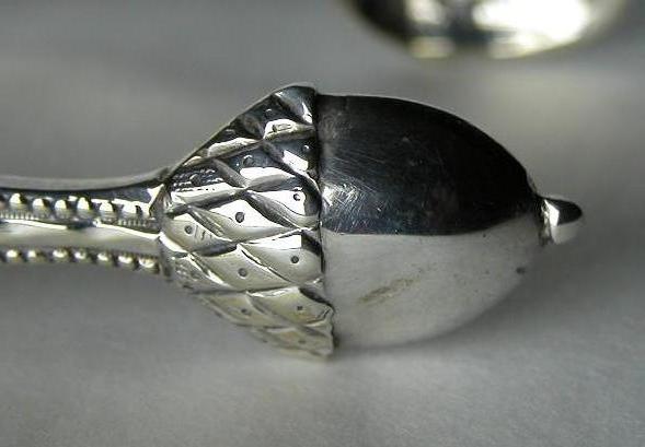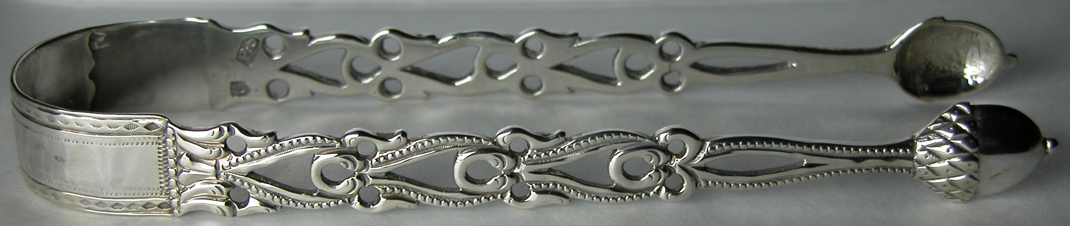 These tongs are a lovely pair of tongs and the only pair I have seen with acorn bowls. They are clearly marked with the Birmingham marks of 1779. The really sad part about them is the repair. A plate has been soldered inside the bow and it has made a proper mess of the outside! click on any picture to enlarge |