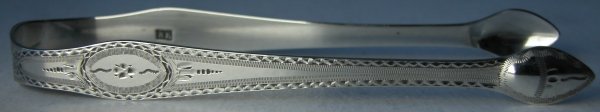 sugar tongs. Both pairs of tongs are marked "RE" for Richard Evans,