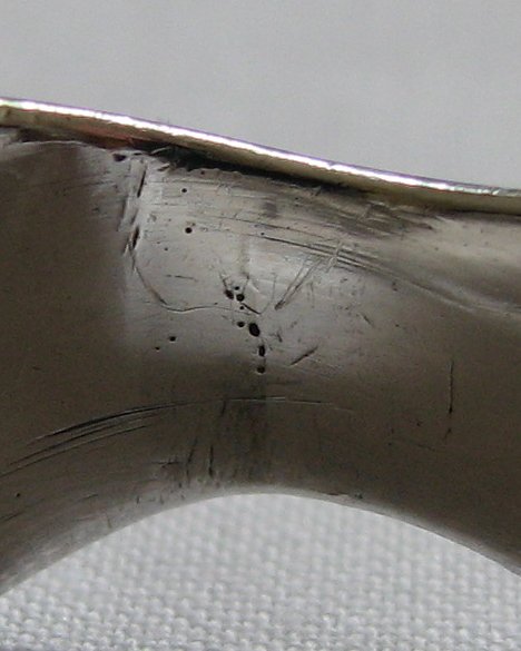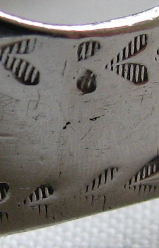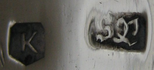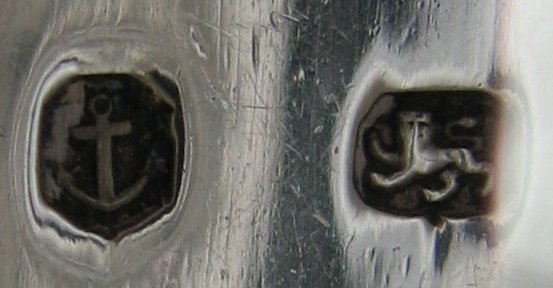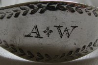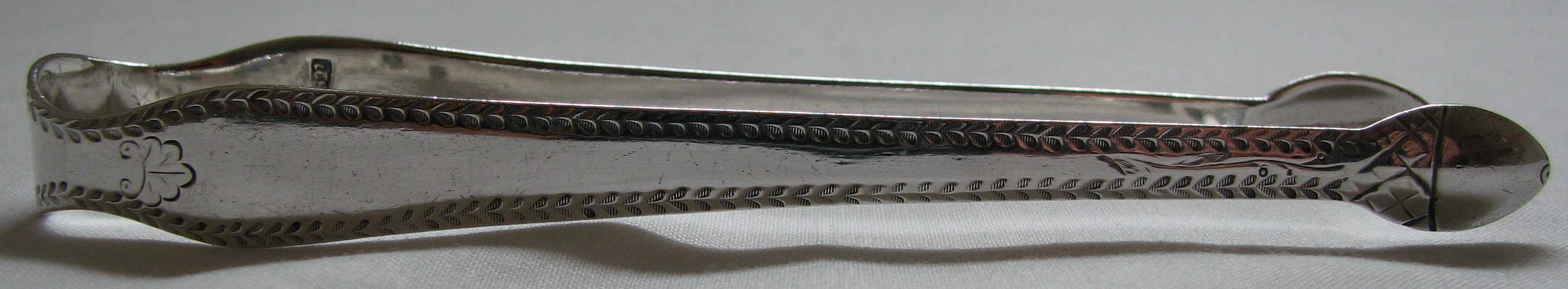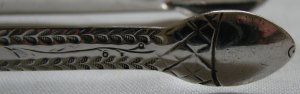 This pair of tongs is a lovely early pair of tongs, dated 1782/83 with the early maker's mark. They are flared and bright cut tongs with trailing buds at the bottoms of the arms and a shell or flower motif at the top. They have a bright cut feather edge and acorn style bowls. Sadly there is a repair to the shoulder but this is well done & only just noticeable. Click on any picture to enlarge |