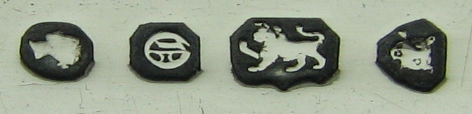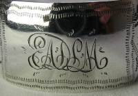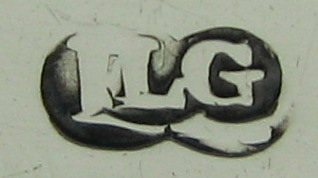 These tongs are standard London fiddle pattern and clearly over-struck. While the maker's mark looks like "FLG", this is just because it has not been struck very well. These are bright cut engraved tongs with the standard style bright cut engraving for John Le Gallais' work.; These tongs have a 5 letter monogram that appears to be "EADLM". This is normal for Channel Islands monograms. They are dated 1849/50. click on any picture to enlarge |