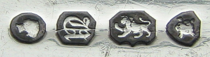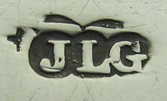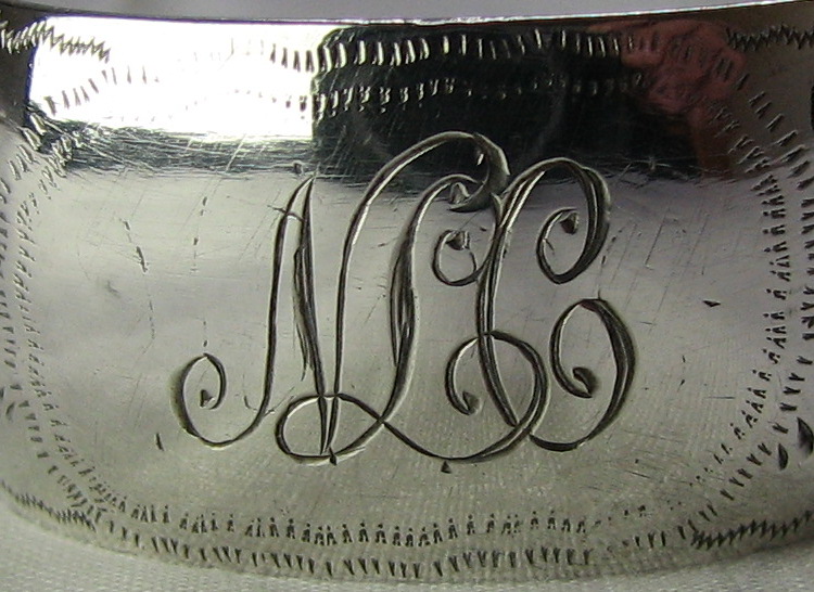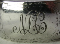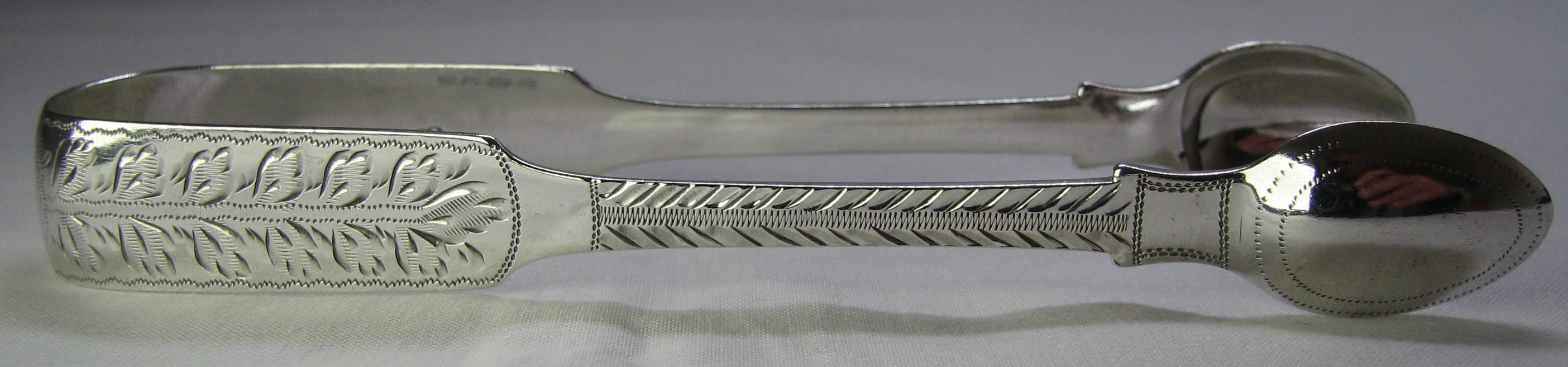These tongs are standard London fiddle pattern and clearly over-struck. These are bright cut engraved tongs with the standard style bright cut engraving for John Le Gallais' work with a delightful zig-zag pattern along the arms. These tongs have a 3 letter monogram that appears to be "NLC". They are dated 1855. click on any picture to enlarge |