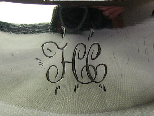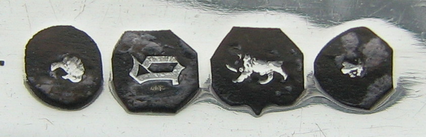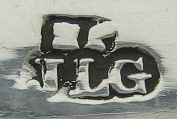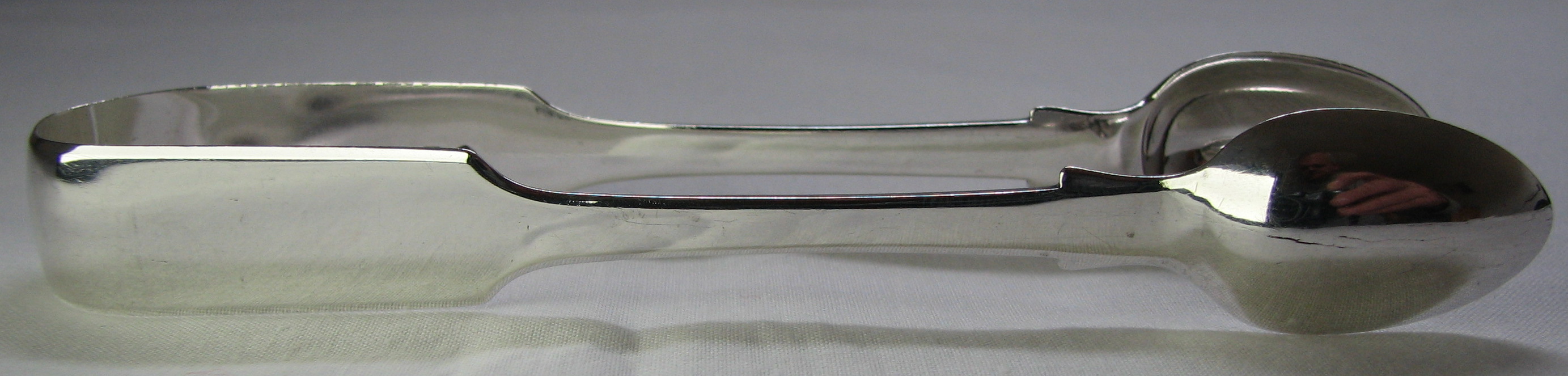 These tongs are standard London fiddle pattern and clearly over-struck. The are completely plain and the over-struck maker's mark is very easy to see. Is it the Lias brothers? The monogram is just two letters which is a little unusual for Channel Islands monograms. They are dated 1862. click on any picture to enlarge |