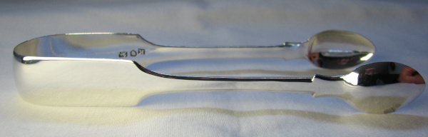 John Coakley was a Liverpool manufacturer who was working some time around the 1820’s. He later sold his business to John Sutter. These tongs are standard fiddle pattern tongs with full Chester marks for 1828.