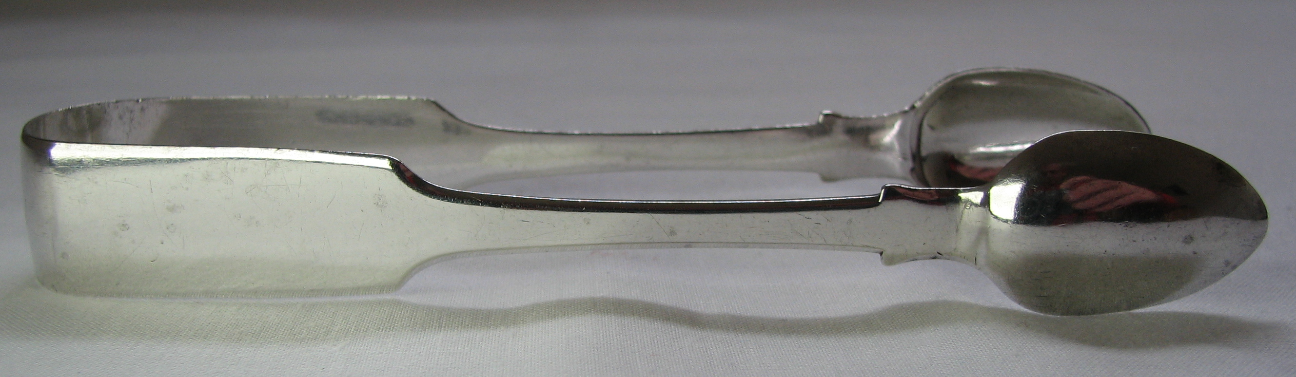 John Sutter was a Liverpool silversmith who was first registered in Newcastle in 1832.; He is believed to have been working between that time and 1864. These tongs are standard fiddle pattern tongs, dated 1842, with a lovely monogram “A. I. Wilkie”.