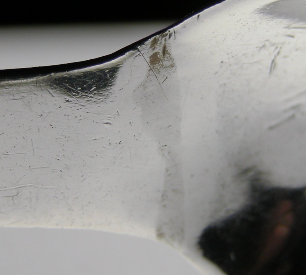 a solder repair that is quite difficult to detect. The dead giveaway is the break in the pattern on the outside of the arm. There is also a slightly discoloured wavy vertical line that can be seen.
