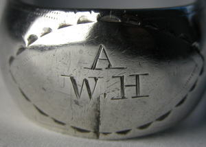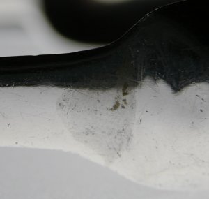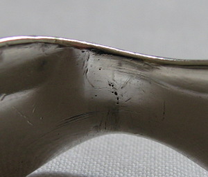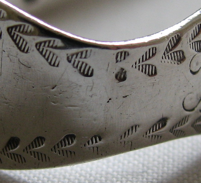 A repair to the bow. Notice the faint discoloured line in the centre, partly disguised by the fact that the monogram is partially worn away. A close look will also show that the engraved edging is not complete, partly "broken" both top and bottom.