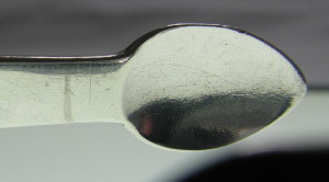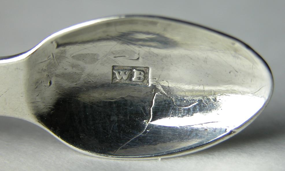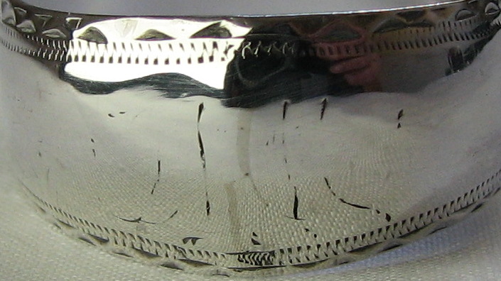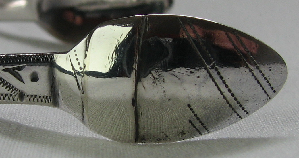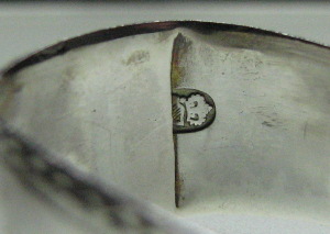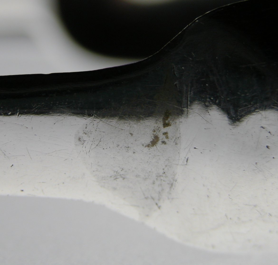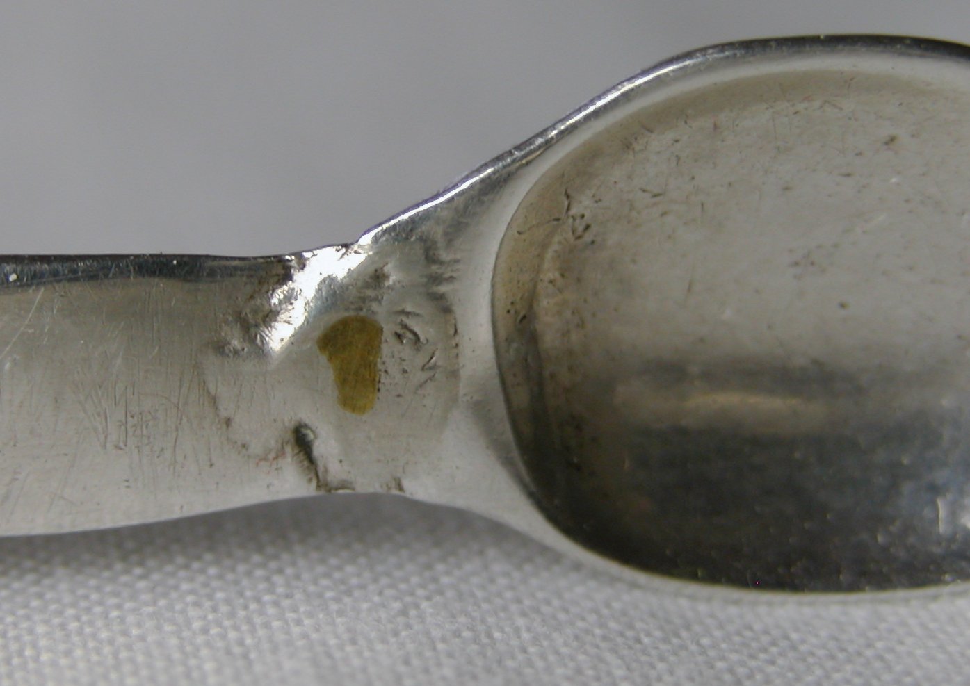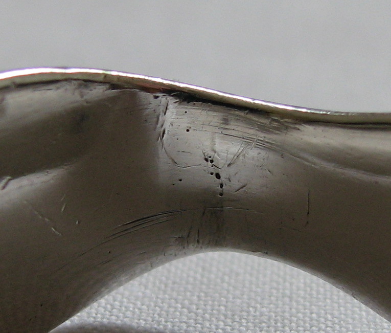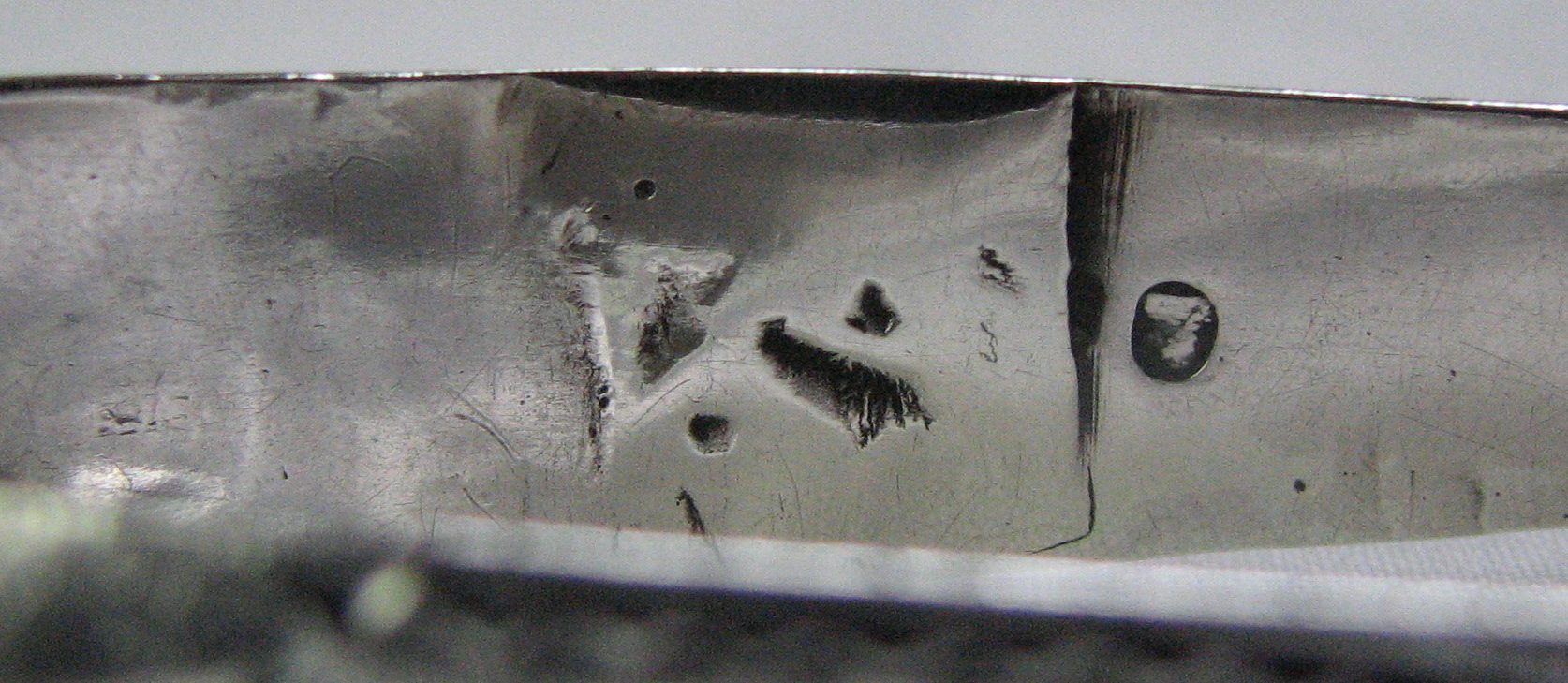 a plate repair to the top of one arm. This has not been very well smoothed, making it obvious. Also, the silver-smith has placed the repair over the top of the hallmark so only half of the mark can be seen.