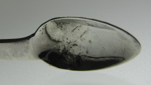 this is an interesting repair as the silver-smith has used both a plate and solder. There is a plate across the outside of the bowl and the damage on the inside has also been soldered.