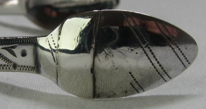 Missing or rubbed maker's marks - sugar tongs can sometimes have some part of the marks missing. This can easily happen through years of polishing or if the mark was not struck well at the time of manufacture. Often the mark is only partly rubbed. This can make it difficult to identify the maker, but not necessarily impossible because some maker’s marks are so distinctive that they can be readily identified even if only a small part of the mark remains. The lack of a maker’s mark is not necessarily important especially if they are a particularly interesting pair of tongs. | |