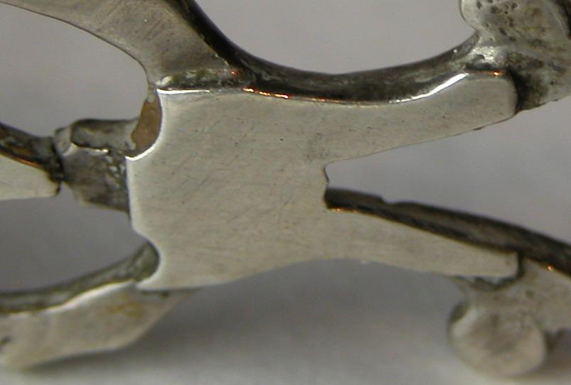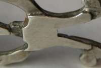 The most common form of damage to be seen on sugar tongs is a split in the centre of the bow (or "spring" as the silver-smith would call it). This comes about from many, many years of compressing the bow to use the tongs. Often this has been repaired - see below.