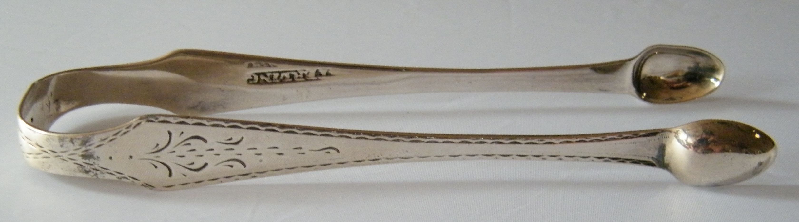 Jackson shows John and Samuel Nicolson working in partnership between c1775 and c1780 as silversmiths. These tongs are a lovely pair of bright cut engraved tongs, with shaped and cut-in shoulders. Pictures are by kind permission of a collector.