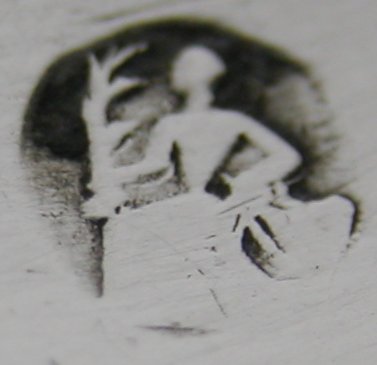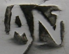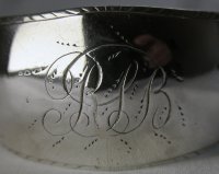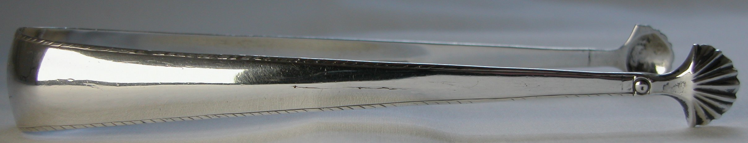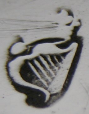 Jackson shows a maker’s mark of “AN” on the Dublin pewter plate, dated between 1765 and 1812. He attributes this mark to Ambrose Nicklin. There is no other reference to a Dublin mark of “AN” so we cannot be completely sure of the attribution. These tongs are quite special in that the bowls are cast and soldered onto the arms (the solder marks can clearly be seen). They are engraved with a simple feather edged engraving. From the shape of the Harp and Hibernia, the tongs will be dated c1770 to 1775. Click on any picture to enlarge |