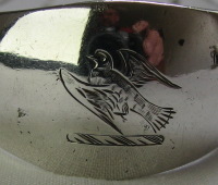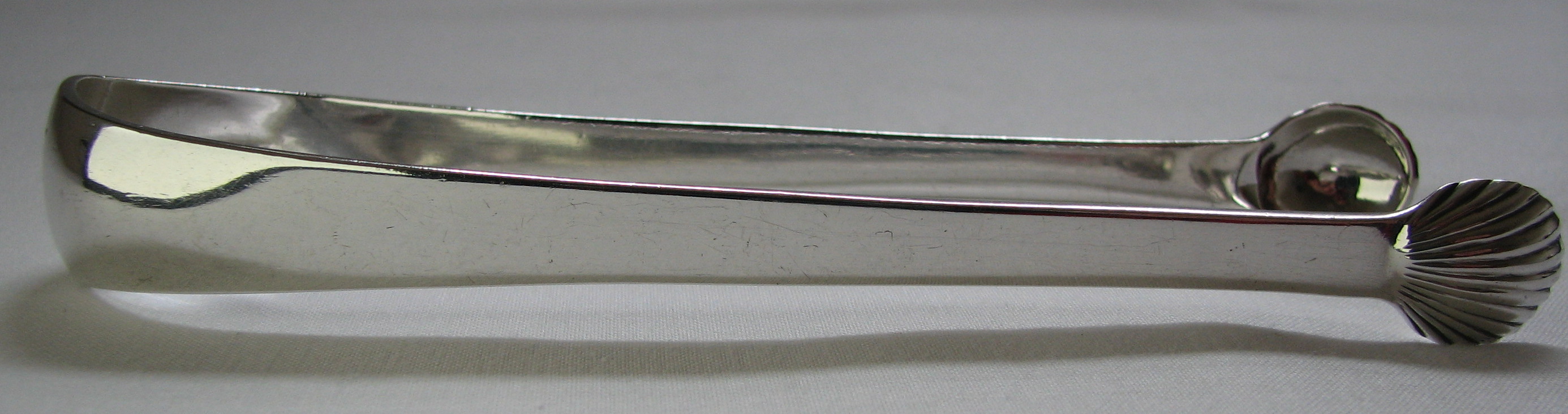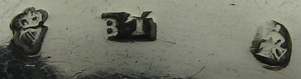 These tongs are completely plain with small circular deep cut shell bowls. They are very heavy, weighing over 55 grams and have a delightful monogram of a flying falcon or is it a pigeon or a dove? The tongs are dated no later than 1786 as can be seen from the combination of Harp & Hibernia. It is also interesting that the maker's mark is in a plain rectangular punch, without the serrated edge & has a pellet between the two letters. Click on any picture to enlarge |