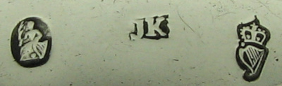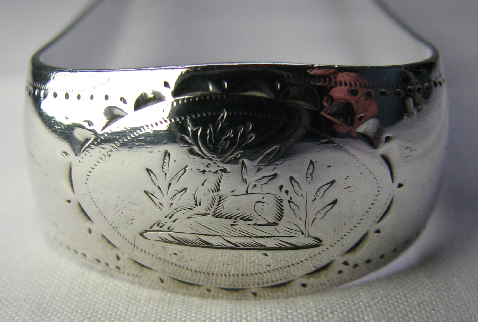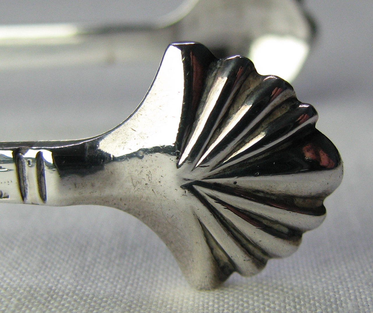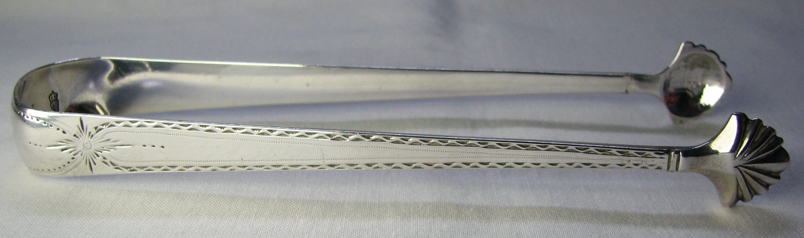 These tongs are an earlier style, with scalloped bowls, reminiscent of cast tongs. They have the expected Irish star engraved to the tops of the arms which have a bright cut engraved pattern down the edges. The hallmarks indicate they are dated approximately between 1775 and 1786, but definitely no later than 1786. Click on any picture to enlarge |