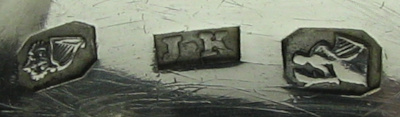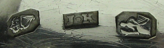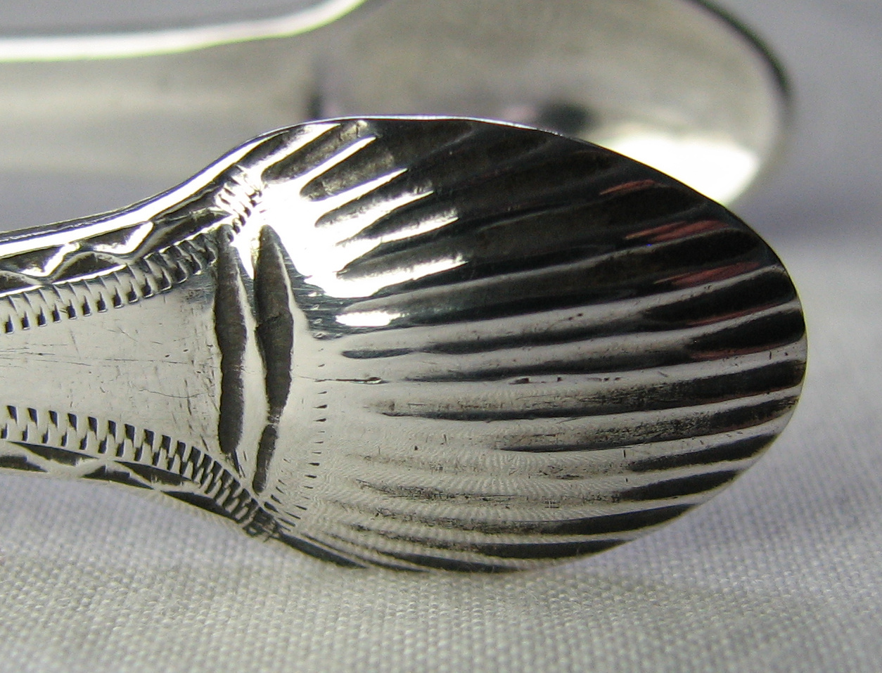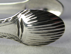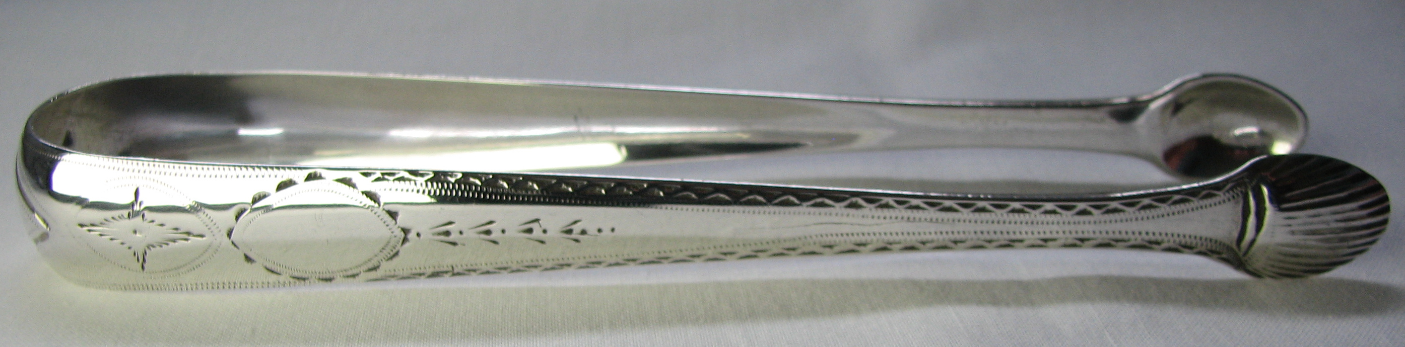 These tongs are a lovely pair of typically Irish tongs with the arms being slightly concave and a star engraved to the tops of the arms. The makers mark is in a rectangular cartouche and has a pellet between the letters. The hallmarks date these tongs at between 1793 and 1809. Click on any picture to enlarge |