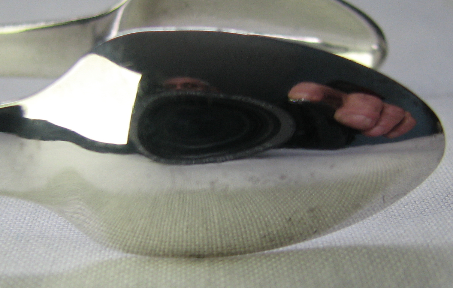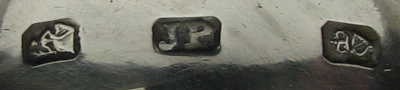 These are completely plain, with concave arms and pointed bowls, slightly reminiscent of Scottish tongs of this perieod. They are quite large at just over 6 inches in length and weighing 45 grams. The hallmarks are rectangular with cut corners, dating them between 1793 and 1809. Click on any picture to enlarge |