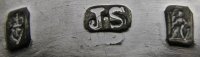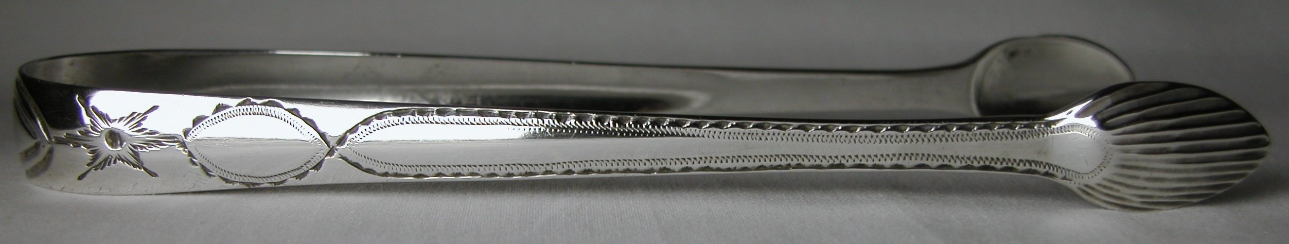These tongs could be by John Shields, however they are probably dated too late for John Shields. From the shape of the Harp & Hibernia, they appear to be dated between 1797 & 1805. James Salter was a Cork maker but his work is known both with and without Dublin marks. He is therefore a more likely contender. They are a lovely pair of typical Irish tongs with the familiar star engraved at the top of the arms. Click on any picture to enlarge |