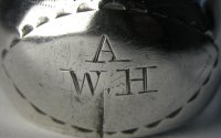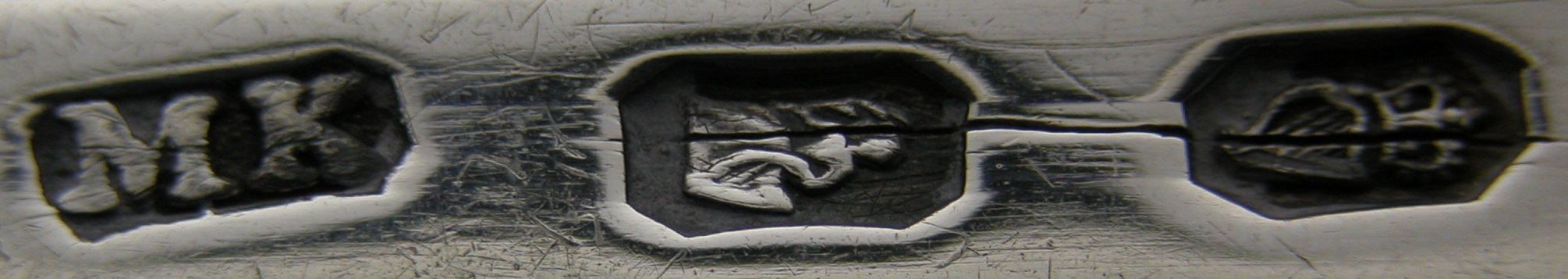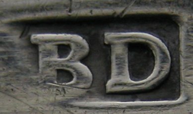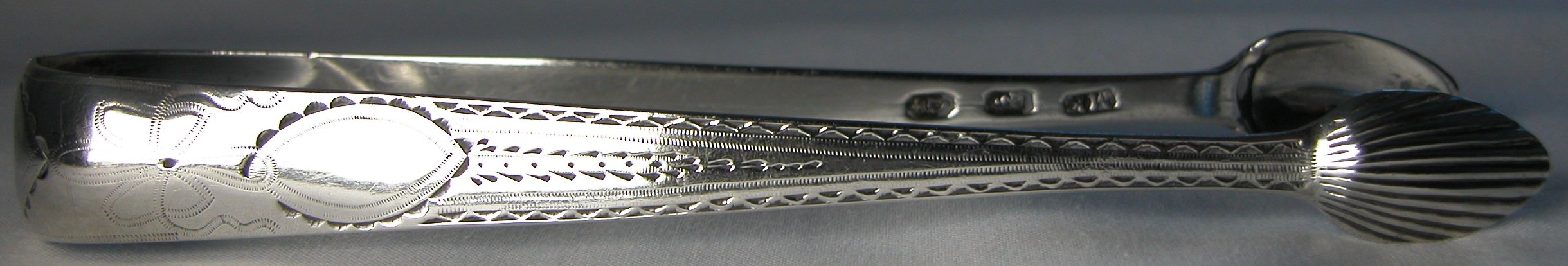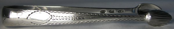 This is a pair of Irish Georgian silver sugar tongs, particularly unusual as they are the only pair of tongs that I have ever seen with 2 maker’s marks struck. Both marks are very clear – the first, (Michael Keating) having been struck with the hallmark and the second some time later. The Michael Keating mark looks to date from about 1793 and the BD mark, (Bartholomew Delandre?) presumably some time later. It is known that Michael Keating did some time in prison around that time for selling below standard silver. Was his, (bankrupt), stock sold off and re-marked by others? The likely answer to this little conundrum is that the second mark was struck by the retailer. Generally when this was done with other tongs, the retailer would over-strike the original maker’s mark, so why were two separate marks struck on these? Is it that they are Irish and they chose to be different from the English? Whatever the situation, it is very rare to see. Unfortunately these tongs have a split in the bow, which significantly reduces their value. Click on any picture to enlarge |