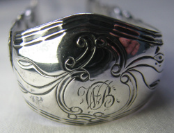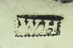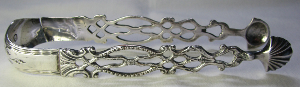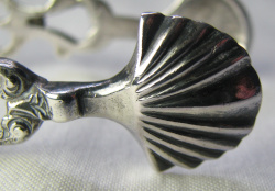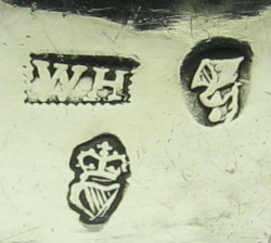 Douglas Bennett records a number of marks by William Hughes, dating them between 1767 and 1784. None of these marks are in a serated edge punch. Jackson also records William Hughes as a Freeman, dated 1767 to 1784. He also records a William Hughes mark dated 1774 but not with the serated edge. There are other makers with the "WH" initials but given that we cannot find any record of this particular mark we cannot be certain of the attribution. This is a pair of cast tongs and it is quite rare to find Irish cast tongs. In style there is nothing to distinguish them from English cast tongs of the same period. Sadly they have a nasty split at the top of one arm but this is not uncommon with cast tongs. The hallmark is lovely and clear and the tongs can be dated some time prior to 1787. I would estimate around about 1770. Click on any picture to enlarge |
