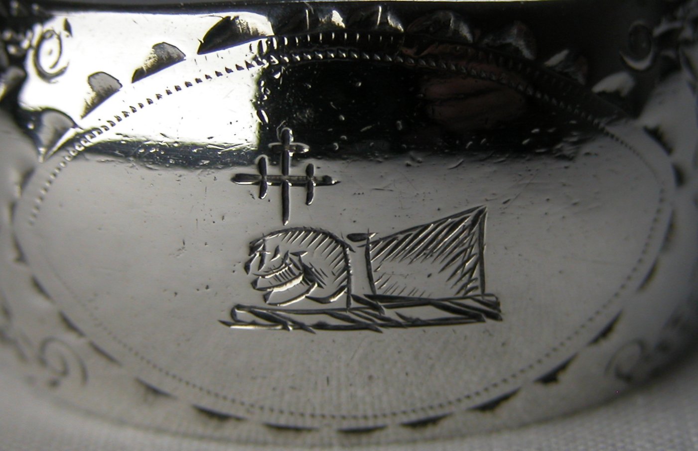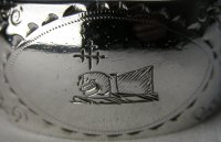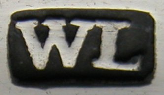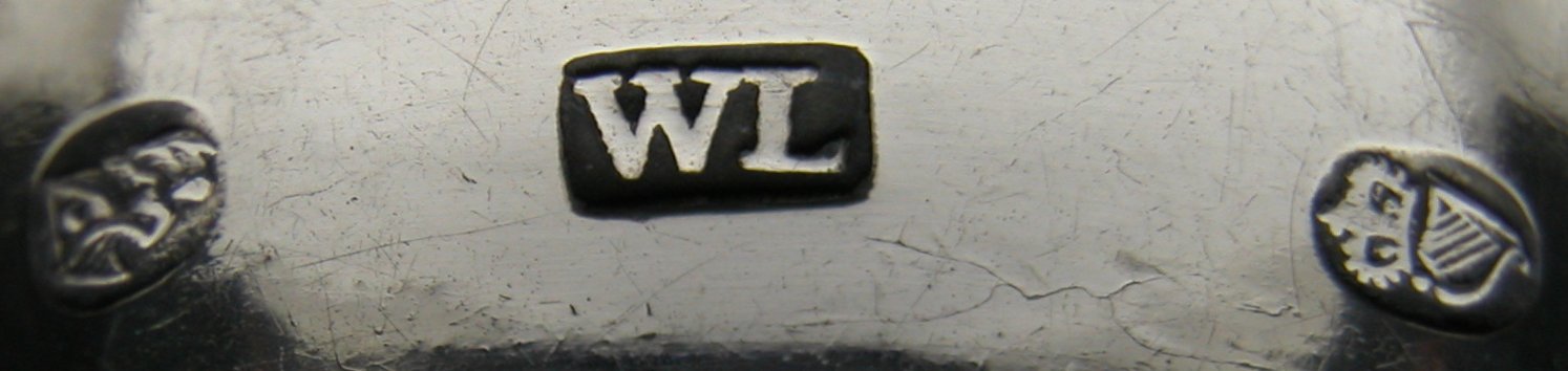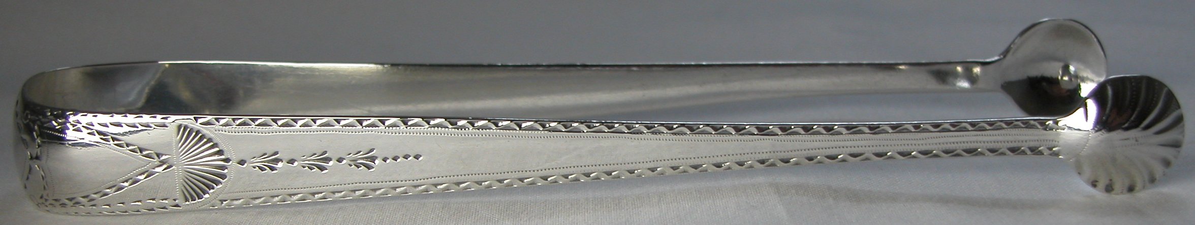 These tongs have the oval marks, dating them between 1787 and 1793. They are a lovely pair of Irish tongs, in beautiful condition. The have a fascinating family crest. Notice that this maker's mark has no pellet between the two letters. Click on any picture to enlarge |