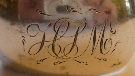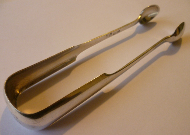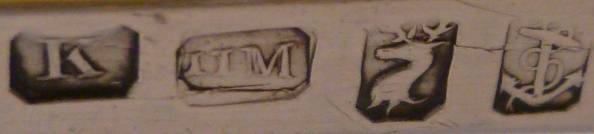 Very little is known about Henry Mouncie other than that he was working in 1827 and that he also died in 1827, aged just 25 years old. Notice these tongs are marked with both the fouled anchor and the Stag's head. These pictures are by kind permission of Bob Gutsell. Click here to see his Provincial silver web-site. Click on a picture to enlarge |