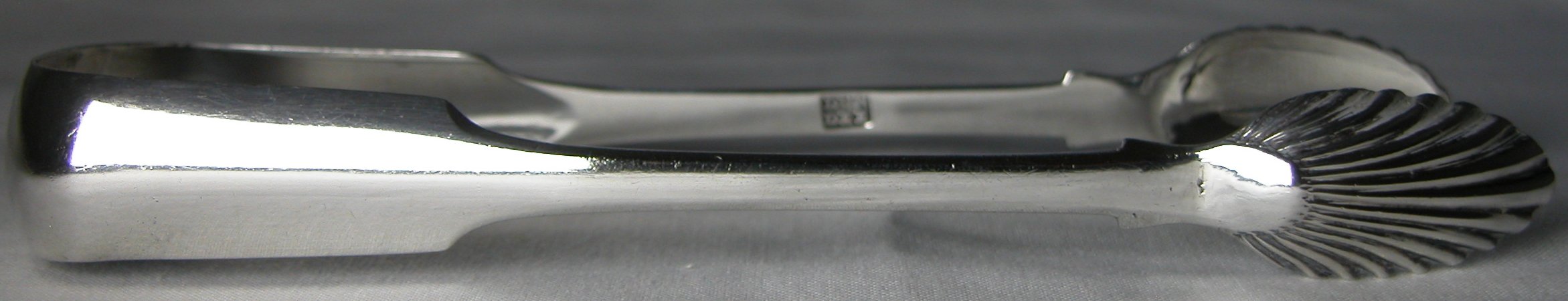 This pair of tongs is very typically Scottish, being fiddle pattern with concave shoulders and bow and having shell bowls. They were made by Robert Dickson II, who is recorded as working between 1796 and 1840. They are probably dated some time between 1810 and 1830.