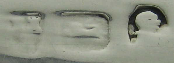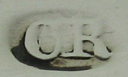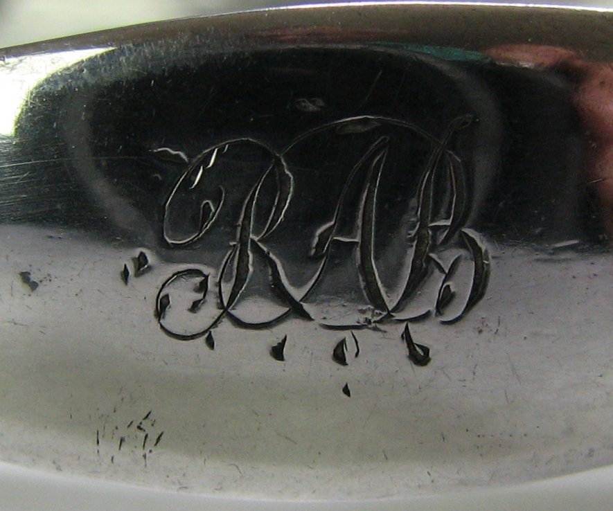 This is another pair of plain flared tongs, also with an engraved monogram. The flare is slightly further down the arms than the other pair. Also these tongs are likely to be dated slightly earlier as they have the maker's mark in an oval shield instead of the rectangular shield. They are probably dated c1800 - 1810. Click on any picture to enlarge |
