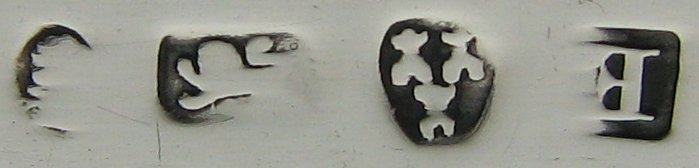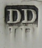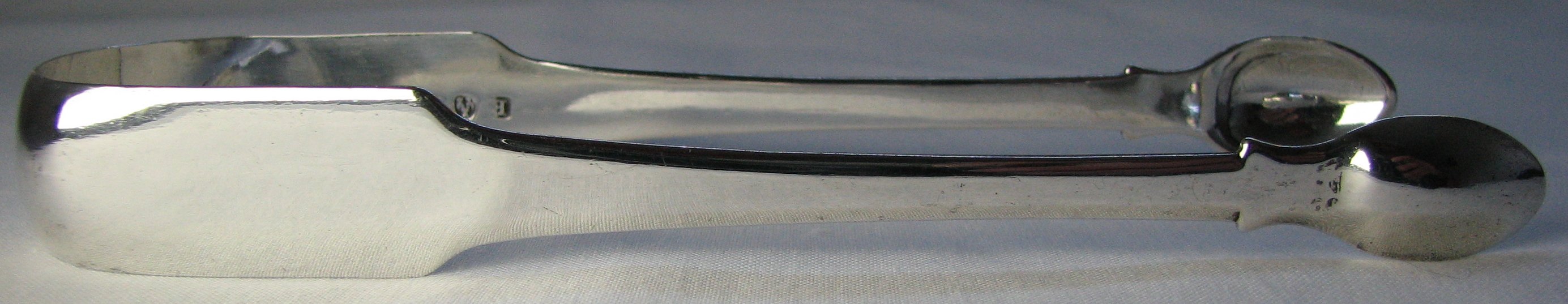Darling & Bell went into partnership on 6th April 1816. They assayed work together between September 1817 and April 1822. The partnership ended when David Darling died. James Bell had been his assistant. Sugar tongs with this maker’s mark are rare as they seemed to focus on jewellery and watches. This pair of tongs are very simple fiddle pattern tongs, dated 1820. Click on any picture to enlarge |