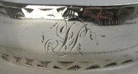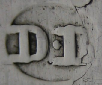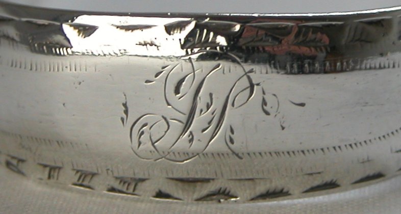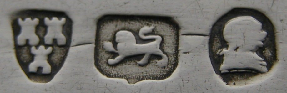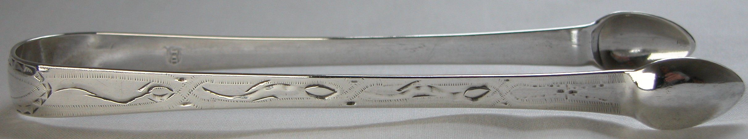 This pair of tongs is bright cut over the whole length of the arms, but not in the bowls. Notice the characteristic trailing flower with a bud motif. There is also very clear fractures where the hallmarks and maker's marks are punched. As is common with Newcastle work it is very difficult to be precise about dates. These tongs will be dated any time between 1804 and 1814 when she was active. Click on any picture to enlarge |