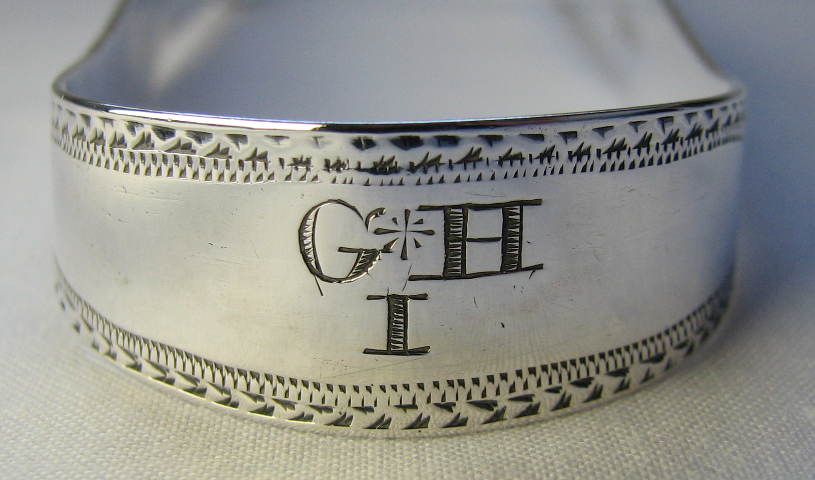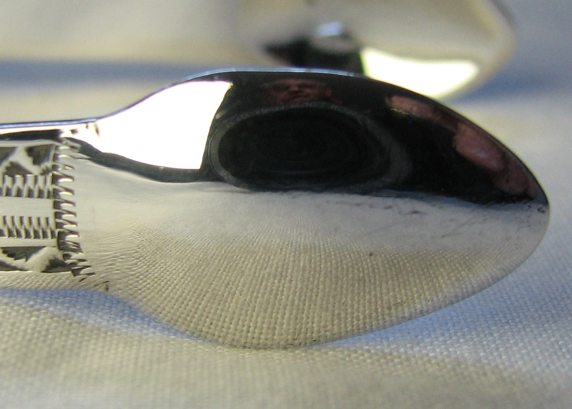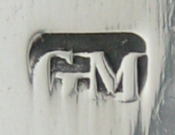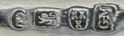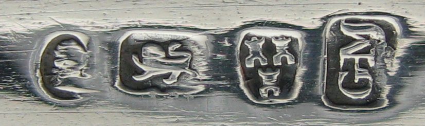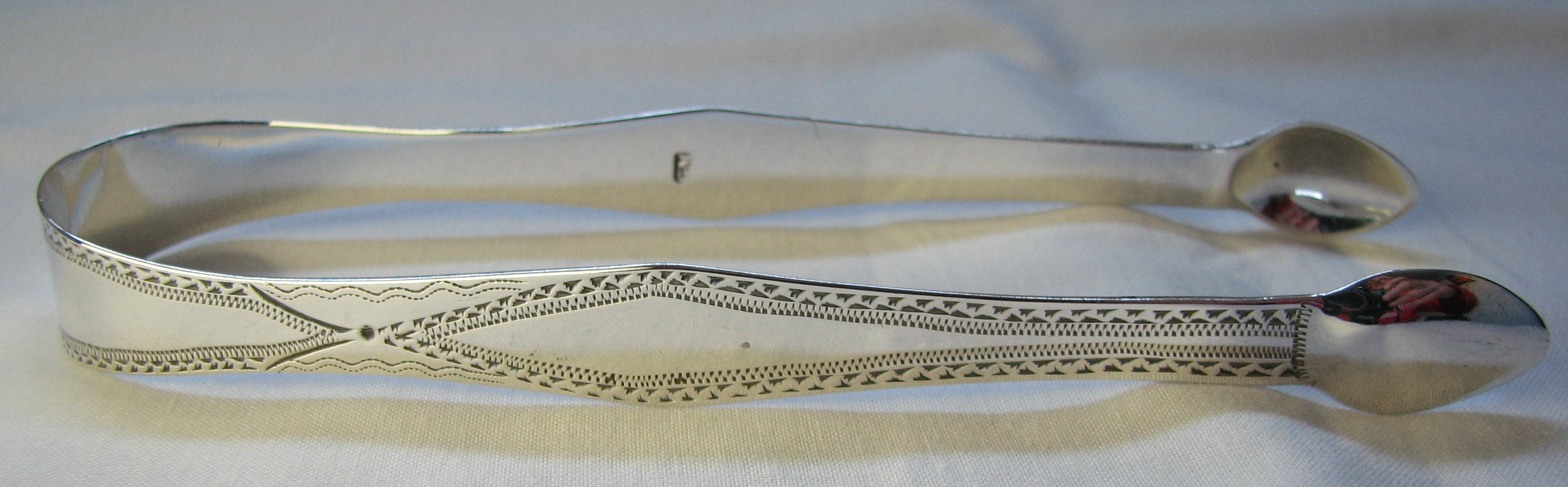 These tongs are flared and bright cut with completely plain bowls. They have a marriage or betrothal monogram. This monogram is highly unusual in that it has the two Christian name initials above the surname initial. I have only ever seen marraige or betrothal monograms with the surname above the Christian names. Dating is difficult, they could be dated any time during the period he was working. Click on any picture to enlarge |