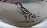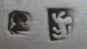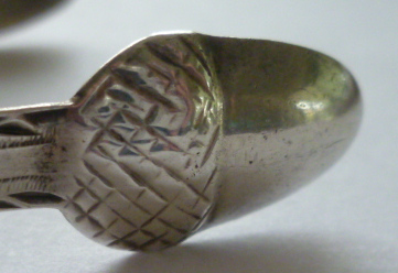 These tongs are a beautiful pair of double flared bright cut engraved tongs, with a concave bow. There is a lovely crest on the bow of a hawk or similar bird. They have acorn bowls and are particularly precious due to the highly recognisable but rare maker's mark with the trophy above it, as well as being marked with the incuse duty mark.