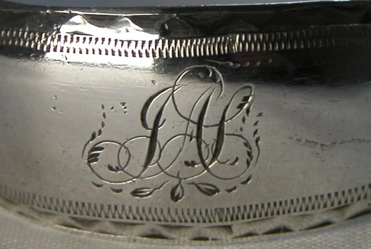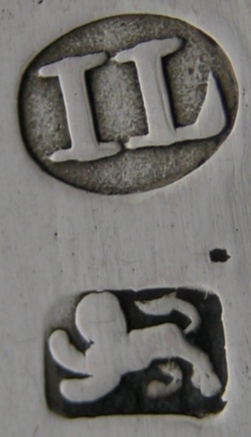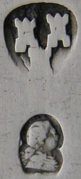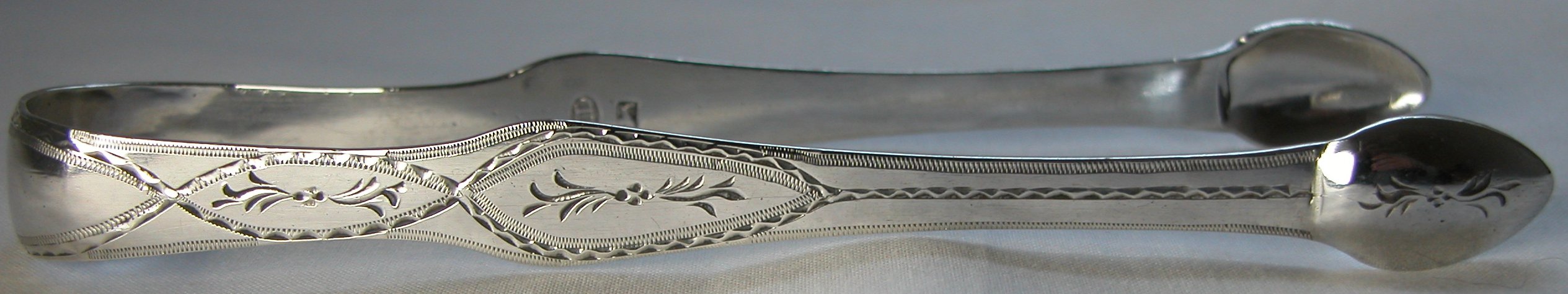 This pair of tongs is a pair of flared bright cut tongs. They are much more in the normal style for the period. They have the trefoil duty mark, dating them between 1797 and 1800. They are marked with the Lion Passant and maker's mark on one arm and the duty mark and town mark on the other arm. This is quite unusual. It would be more normal to see the maker's mark on one arm and the rest of the marks on the other. Click on any picture to enlarge |