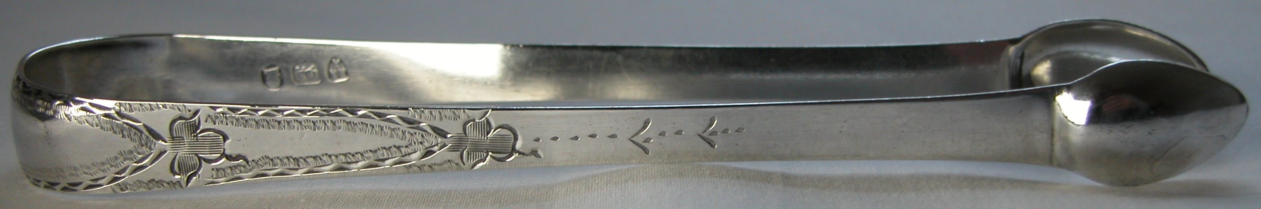 This pair of tongs is much more the standard style for John Langlands II. They have the expected crudely engraved cross and are dated a little later, between 1800 and 1804.