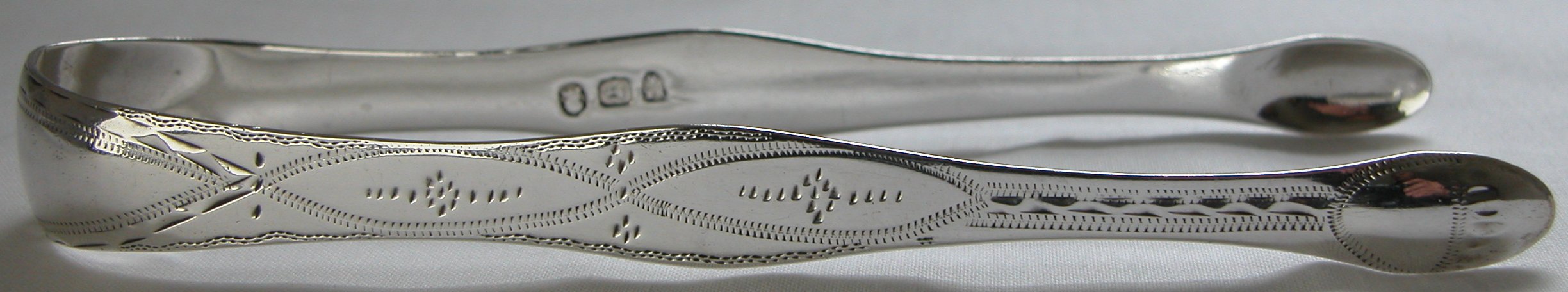 This pair of tongs is a pair of flared, bright cut tongs, dated c1796.