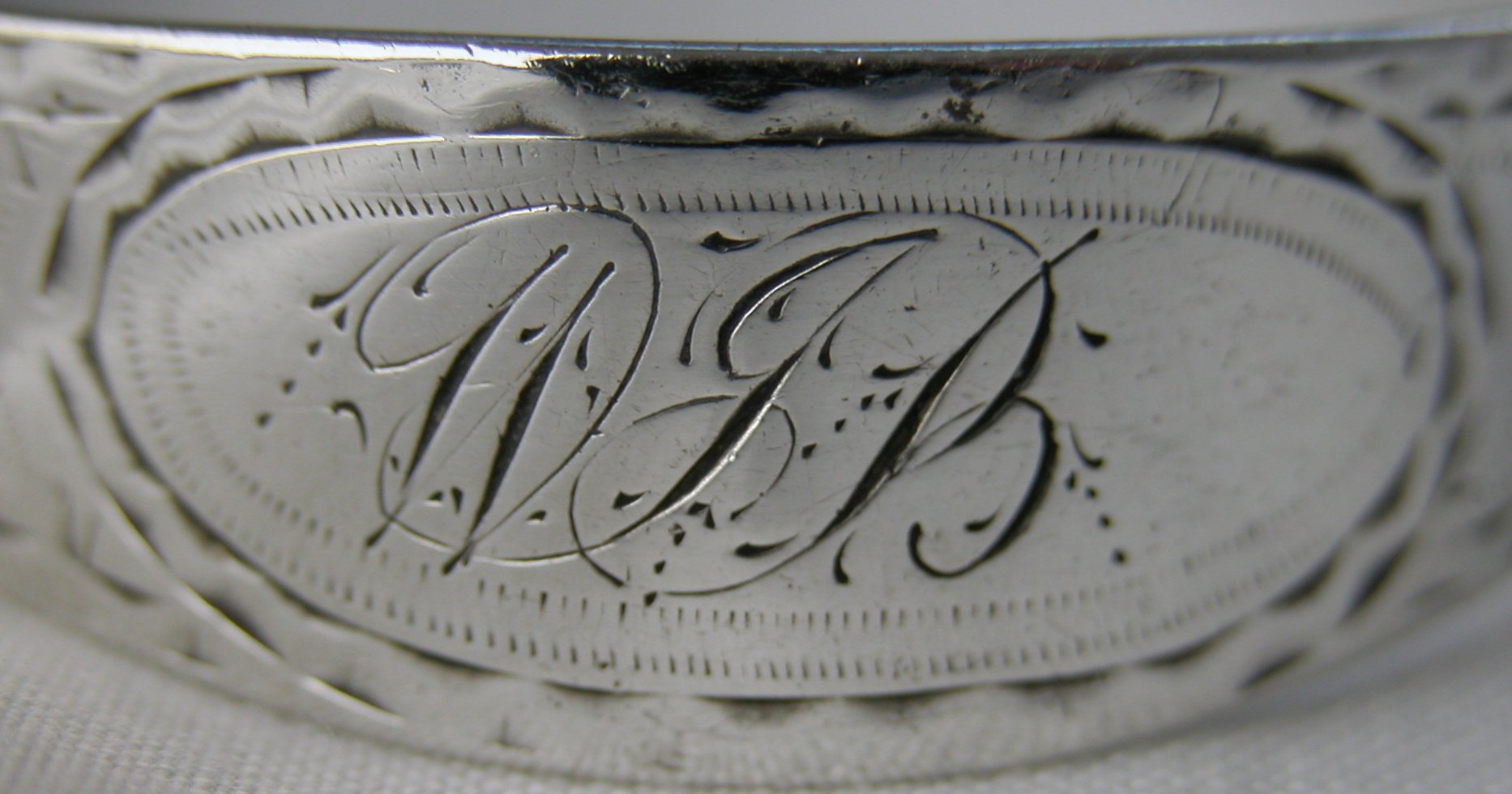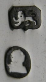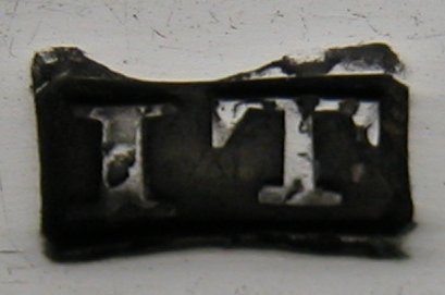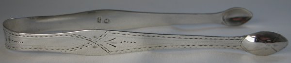 John Thompson II was a Sunderland Goldsmith and according to Grimwade registered his first mark in Newcastle as a plateworker on 12th May 1785. However Margaret Gill records him from 28th October 1777 through to 19th December 1800 and notes payment from him to the assay office on 3rd May 1782. He died on 10th May 1801, aged 54. His premises fronted the High Street in Sunderland. They consisted of a shop as well as "the Worktools, Fistures and every necessary for a working silversmith" We know that he did fashion his own work and send it to Newcastle for assay. However as with other goldsmiths around the country he clearly also bought items from the Bateman workshops and overstruck it with his own mark before selling them on. These tongs are very much in Hester Bateman's style. They are very typical of her work. The maker's mark is very clearly "IT" but a careful examination shows that the mark is over-struck on top of another. If you look at the mark upside down, you can see it has Hester's mark underneath. They are dated c1786 - 1790. Mant Thanks to Michael Baggott for his expertise in enabling us to identify this as John Thompson II of Sunderland. Click on any picture to enlarge |