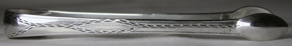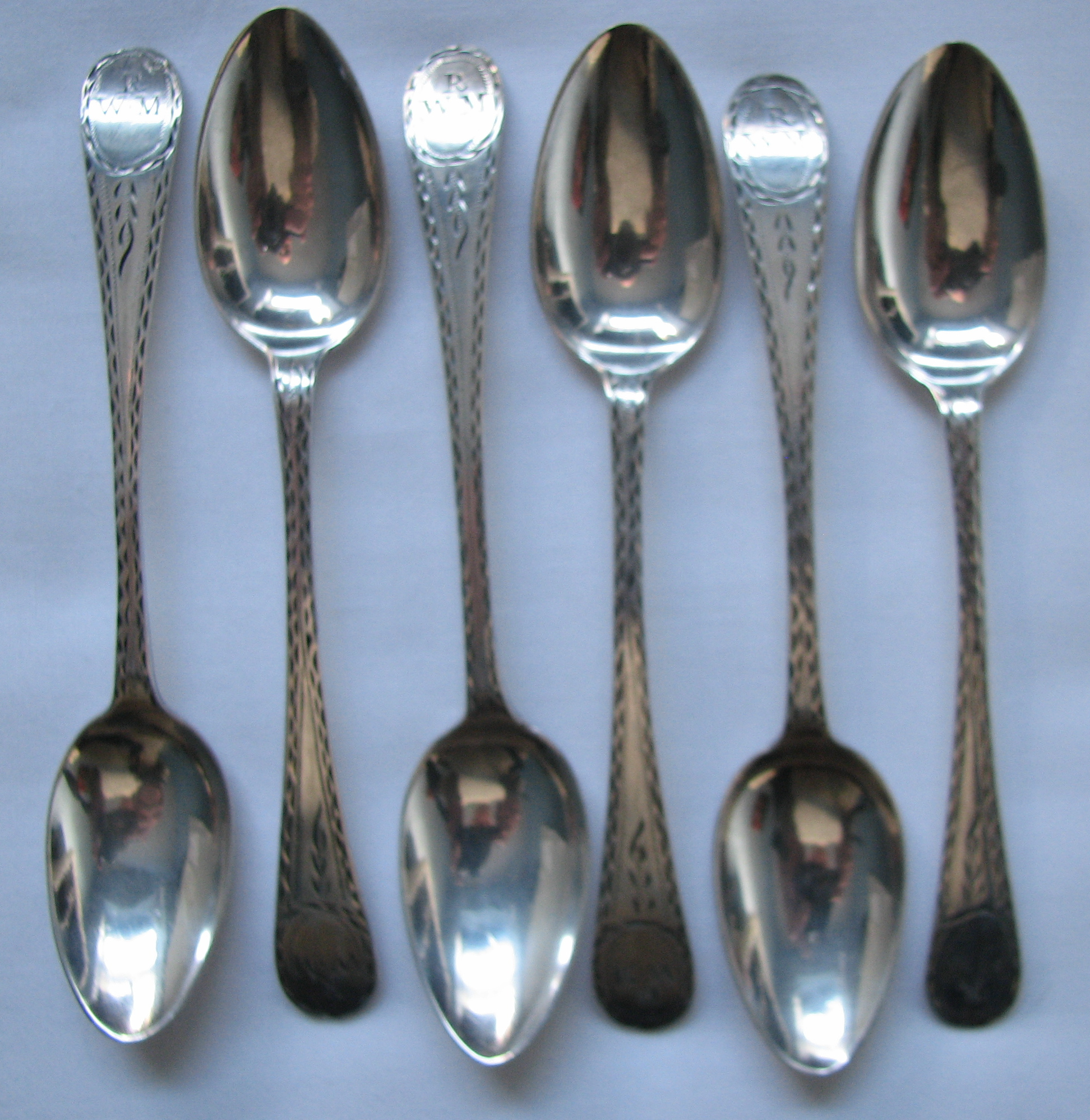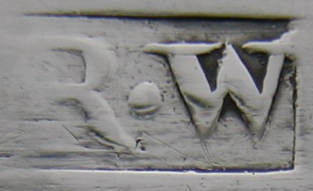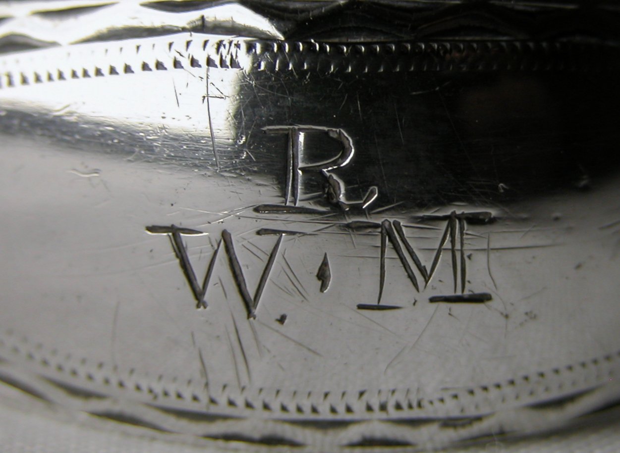 Robert Wilson only worked in Newcastle between 1794 and 1795. He then moved to Scotland, near Edinburgh. Work by Robert Wilson with Newcastle marks is therefore rare. This pair of tongs is particularly lovely as they come with a set of six tea-spoons also marked by Robert Wilson and monogrammed with the same monogram. The “RW” maker’s mark is interesting as there are several Scottish makers displaying the “RW” mark at this time, one of whom is very likely to have been Robert Wilson of Newcastle. Although the monogram is "R.W.M". This will not bear any relationship to the maker. It is a betrothal monogram. The "R" is the surname and the "W" and "M" are first names.