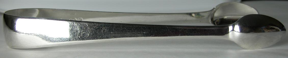 William Stalker founded the firm of Lister & Sons. There is much confusion over dates. His markwas registered with the Newcastle wardens in 1833 but work is seen for many other dates. He died in 1868, opened a shop in Newcastle in 1812 and advertised many times, moving premises in 1830. He had a business relationship with a Sheffield plate manufacturer. This pair of tongs is very ordinary, plain and of the "old English" style and dated 1822. Click on any picture to enlarge |