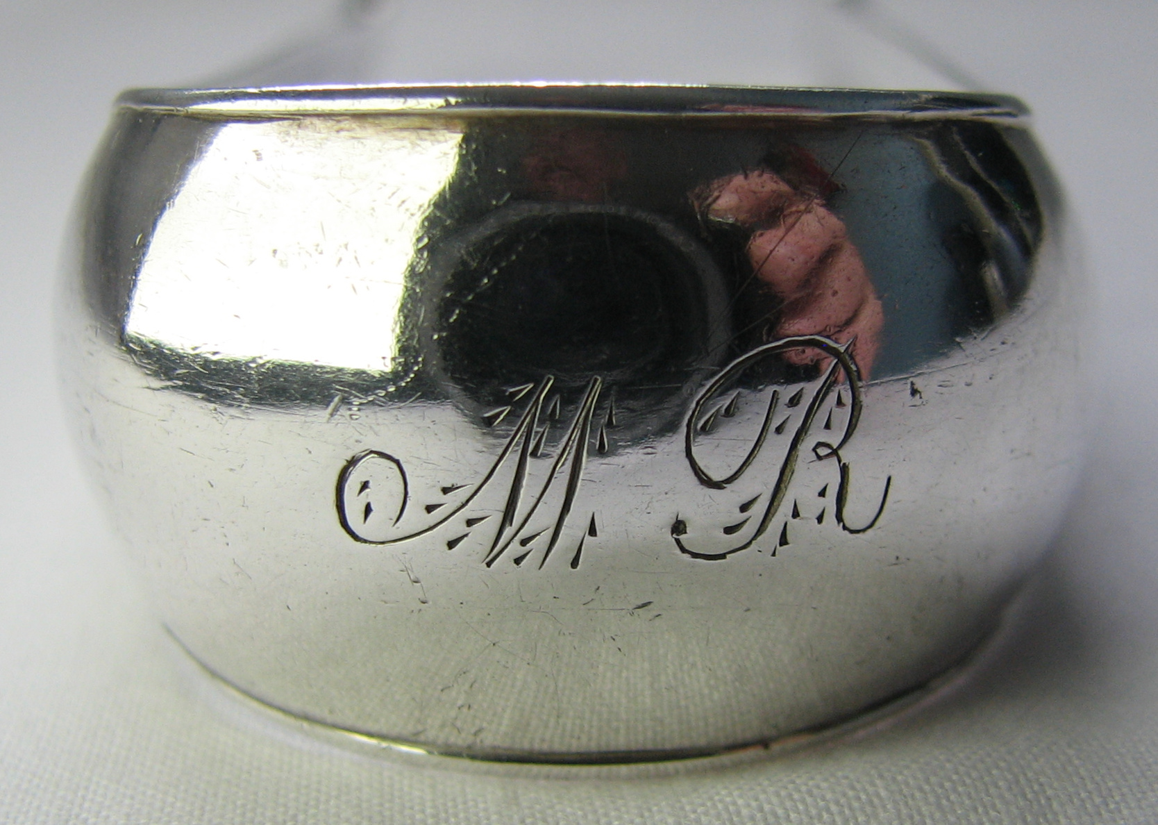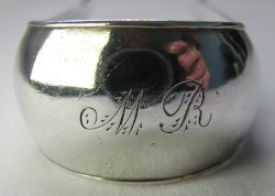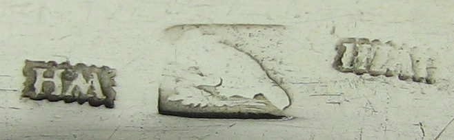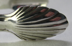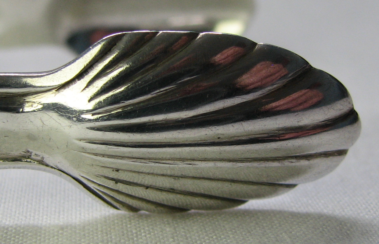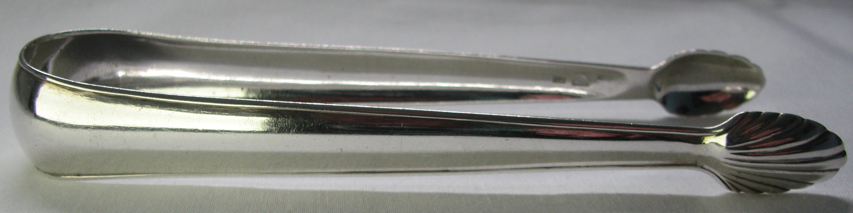 These tongs plain in style, with concave arms and an unusual thread edge to the arms. They are marked with the maker's mark struck twice and the rat mark.