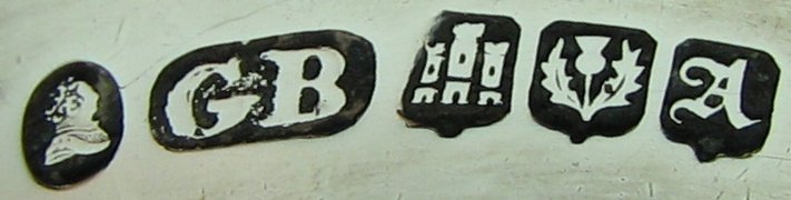 Jackson records a maker’s mark of “GB” seen on a Teaspoon dated 1834/35. beyond this there seems to be little known. These tongs are very typically Scottish in style, King’s pattern, with shell bowls. They have a lovely complete set of Edinburgh hallmarks for 1832. Click here to see more Edinburgh tongs Click on any picture to enlarge |