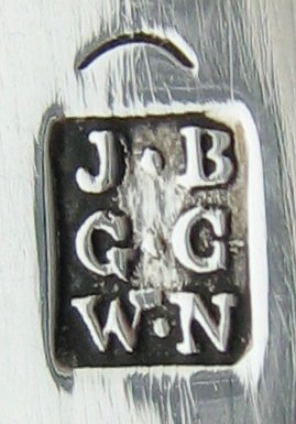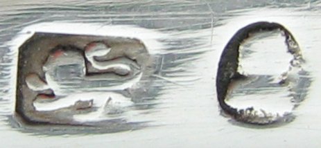 James Barber, George Cattle & William North worked together between 1828 and 1835. This mark followed on from that of James Barber & Co. These tongs are of standard fiddle pattern but have noticeably pointed bowls. Notice the small crescent shape above the maker's mark, probably a journey-man's mark. Click here to see more York tongs Click on any picture to enlarge |