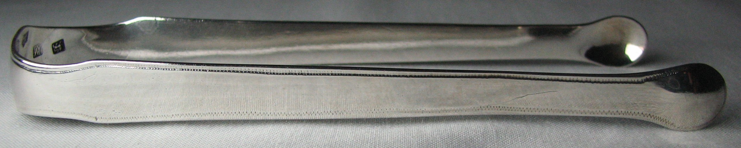 Richard Clark has a mark recorded in Jackson’s dated 1791/92. Jackson indicates that Richard Clark's apprenticeship started in 1760 and that he was made free in 1773. He died in 1797. These tongs are absolutely delightful. They are only just 5ins long and have cut-in shoulders with small circular bowls. They have a tiny engraved pattern around the edges of the arms and bowls. Sugar tongs by this maker are very rare and these are lovely to behold. The maker's mark appears slightly "off-centre". This is just the angle of the picture. These tongs are dated c1780. Click here to see other York tongs Click on any picture to enlarge |