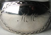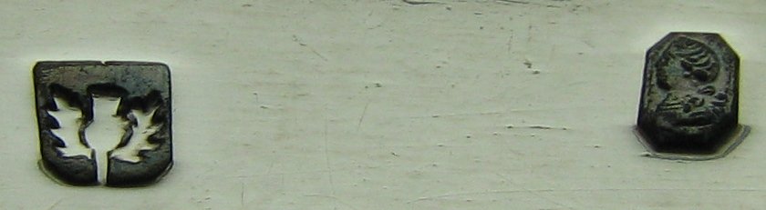 Robert Gray is recorded in Jackson as both Edinburgh and Glasgow. We know that there was no assay office in Glasgow between 1784 and 1819 so Robert Gray would have had to have sent his work to Edinburgh for assay, which would explain why we don’t see Glasgow hallmarks on his work of this period. The Edinburgh mark is shown as 1806 and the Glasgow marks, 1776 – 1784. None of the marks shown by Jackson appear quite as the mark on these tongs. These are a superb pair of early bright cut tongs. They have the incuse duty mark dating them between 1784 and 1786. Click on any picture to enlarge |