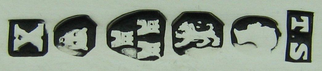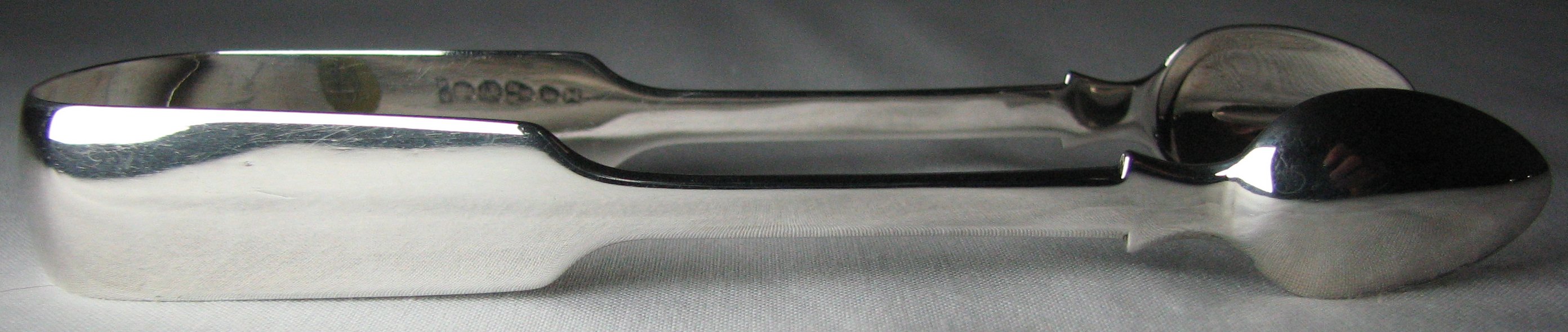 Thomas Sewell I registered his first mark on 20th January 1846 and further marks up to 1st June 1866. He had been apprenticed to Thomas Watson in 1818. Thomas Watson was one of the most prominent of Newcastle silver-smiths at the time. Thomas Sewell was Warden of the Newcastle company of Goldsmiths some 15 times and is reported not to have missed a single meeting, obviously he took the job very seriously! These tongs are plain, fiddle pattern, quite normal for the period and have a full set of hallmarks for 1861. The monogram is little unusual in that it is a betrothal monogram but in script form. Click here to see more Newcastle tongs Click on any picture to enlarge |