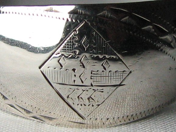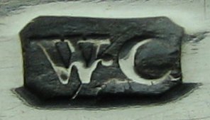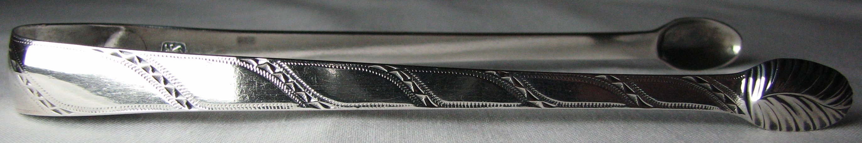 These tongs are of a fairly standard bright cut style but with an unusual diagonal pattern and lovely deep cut leaf pattern engraved bowls. These tongs are also blessed with a fascinating armorial crest. (Danger - I may have photographed it upside down!). Notice that the maker's mark on these tongs has a pellet between the 2 letters, i.e. is different to the other "WC" maker's marks. Again another illustration of how difficult it can be to attribute tongs to a particular maker. These tongs may well have been made by someone entirely different to the other "WC" makers on this web-site. In fact it could well be that these tongs are by William Catell. The tongs are dated c1780 - 1784. Click here to see more tongs by William Chatterton Click here to see more tongs by William Catell Click on any picture to enlarge |
