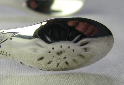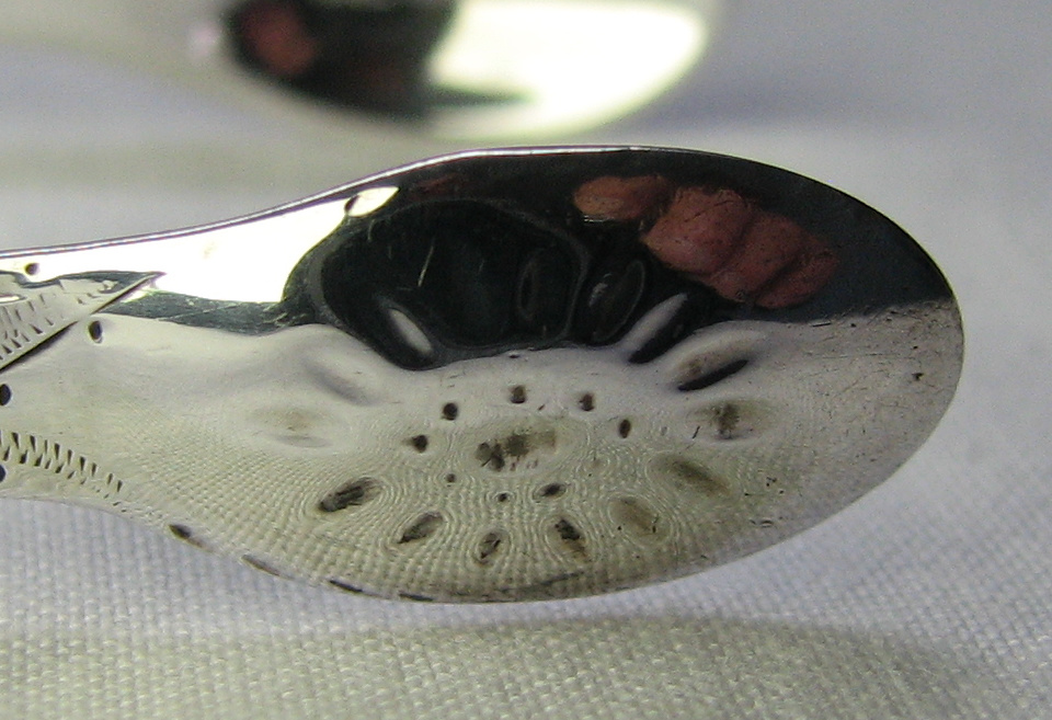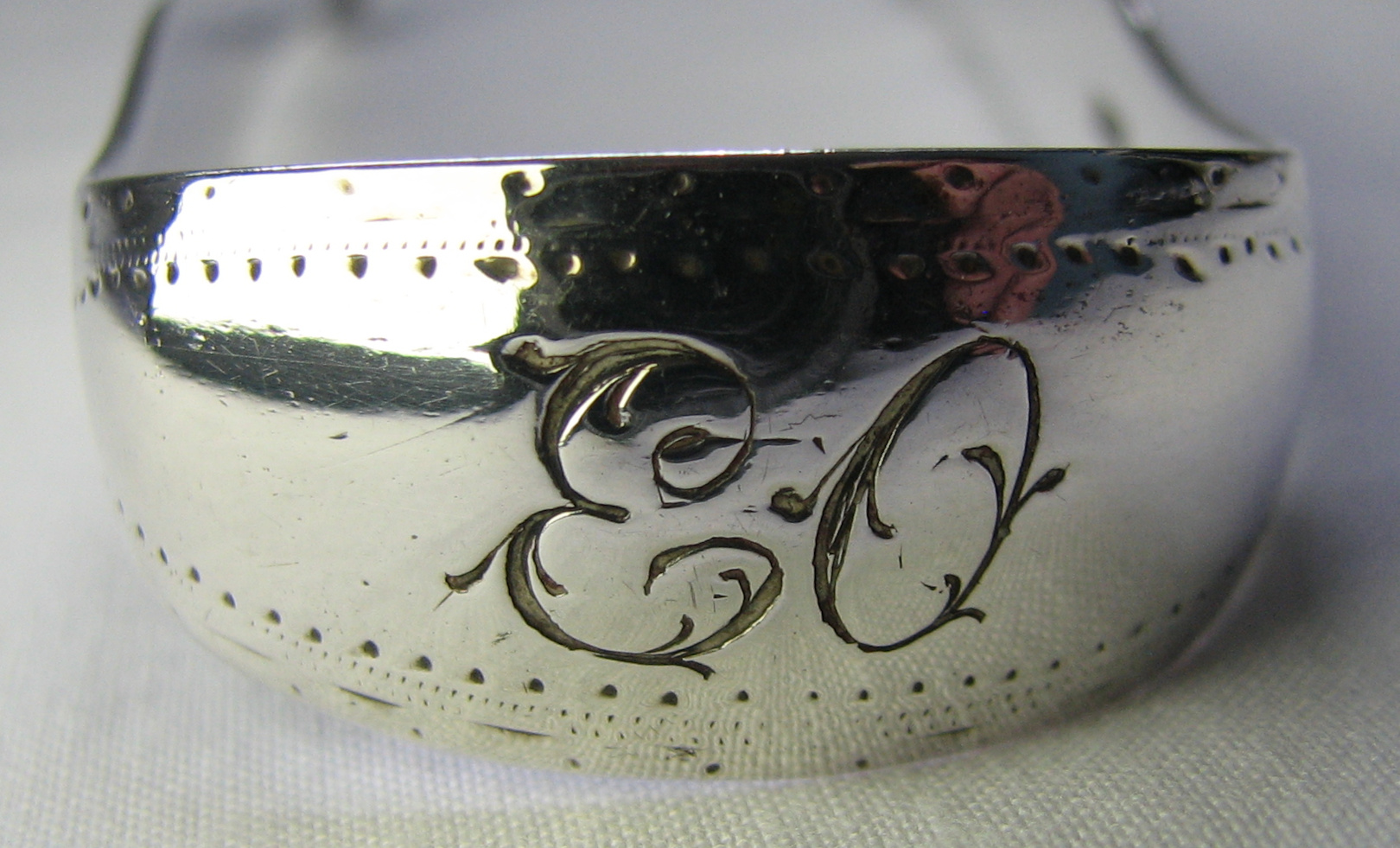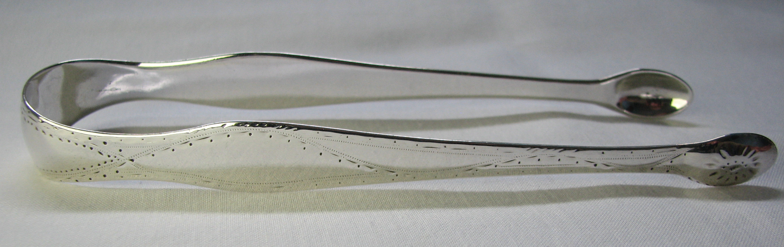 These tongs are flared and bright cut engraved. They ahve clearly had a lot of polishing over the years as the engraving is looking a little tired. Given how clear the monogram is I would suspect it has beeen added later. They are dated 1788/89. Click on any picture to enlarge |