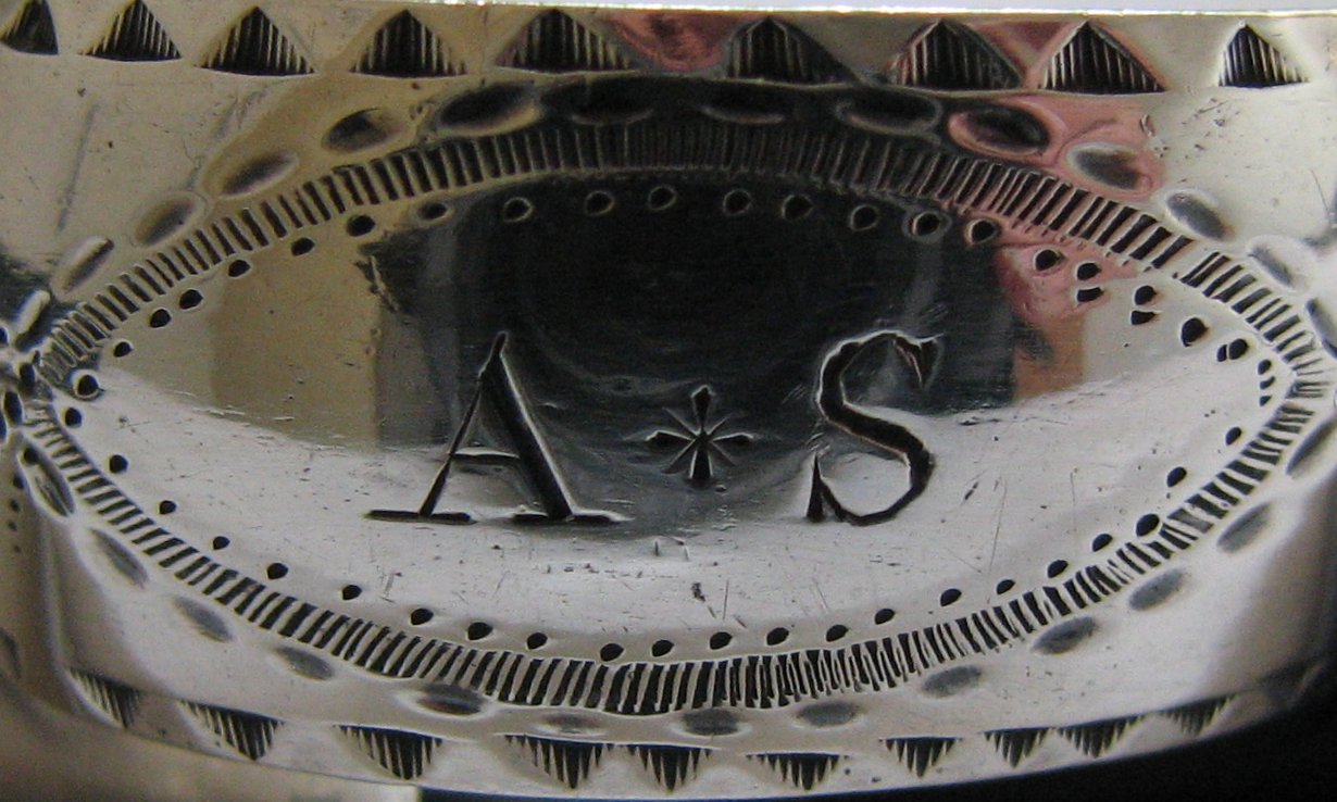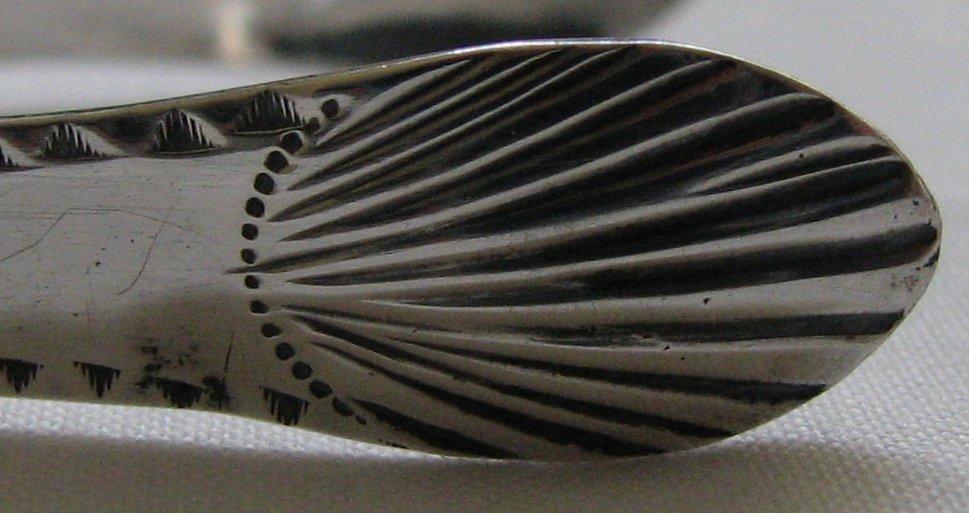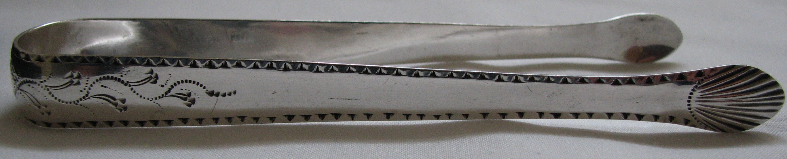 This is a pair of bright cut tongs with a lovely engraved trailing pattern to the top half of the arms. They have a feather edge around the arms and deep cut fan of engraved lines in the bowls. These tongs are dated 1790.