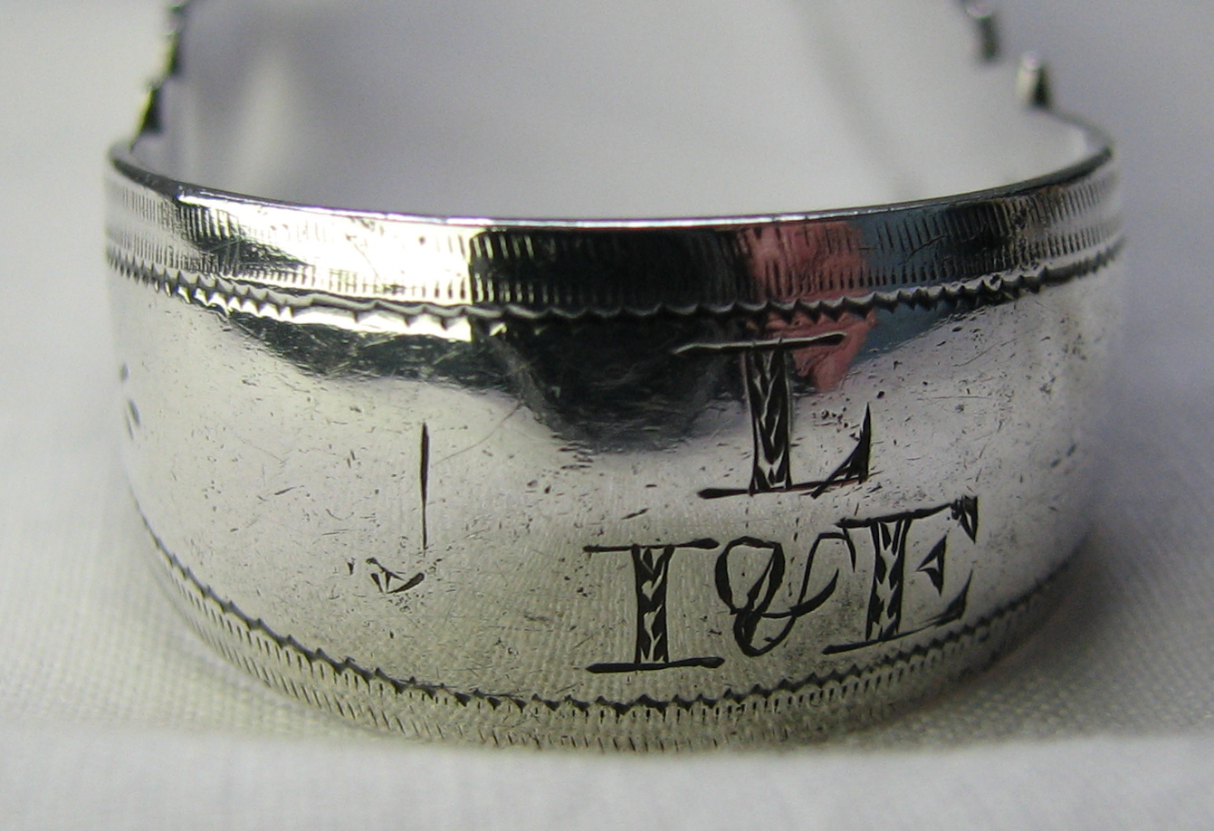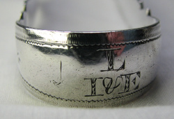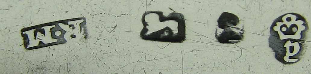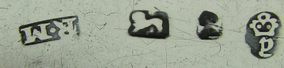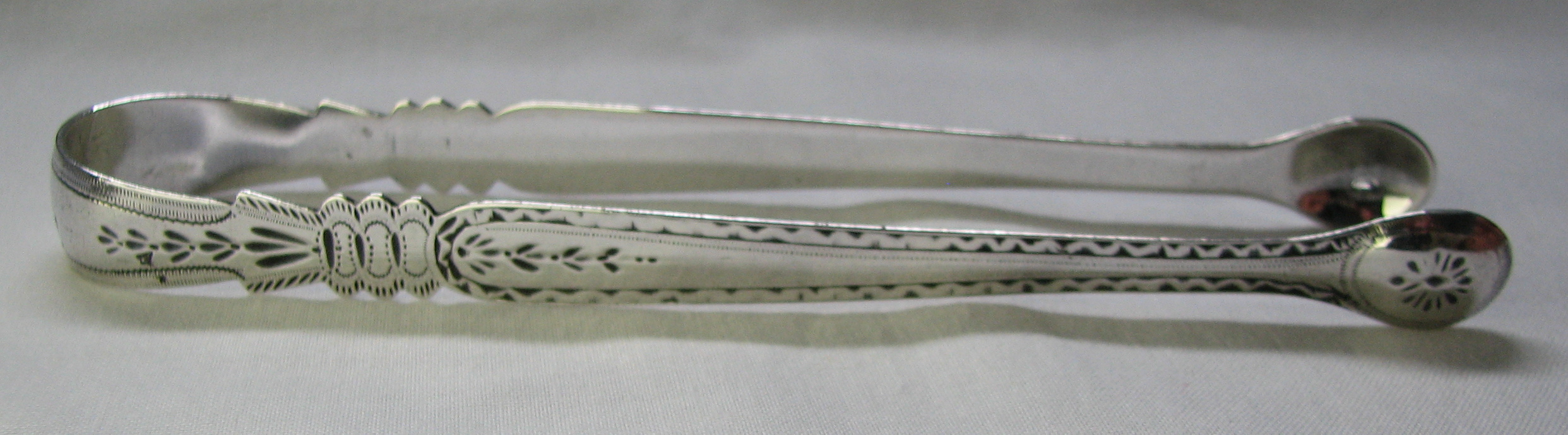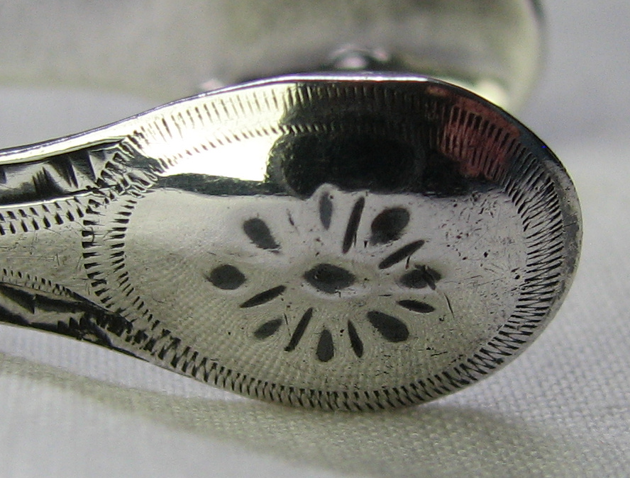 These are another pair of lovely shaped, bright cut tongs. They have cut-in shoulders and the characteristic three protrusions at the tops of the arms. They have circular bowls but these have only a fairly standard engraved pattern on them. These tongs have the expected hallmark seen on sugar tongs with the date letter in a small cartouche, surmounted by a crown. They have the incuse duty mark, dating them at 1785. They also have a somewhat skew wiff marriage or betrothal monogram. Click on any picture to enlarge |