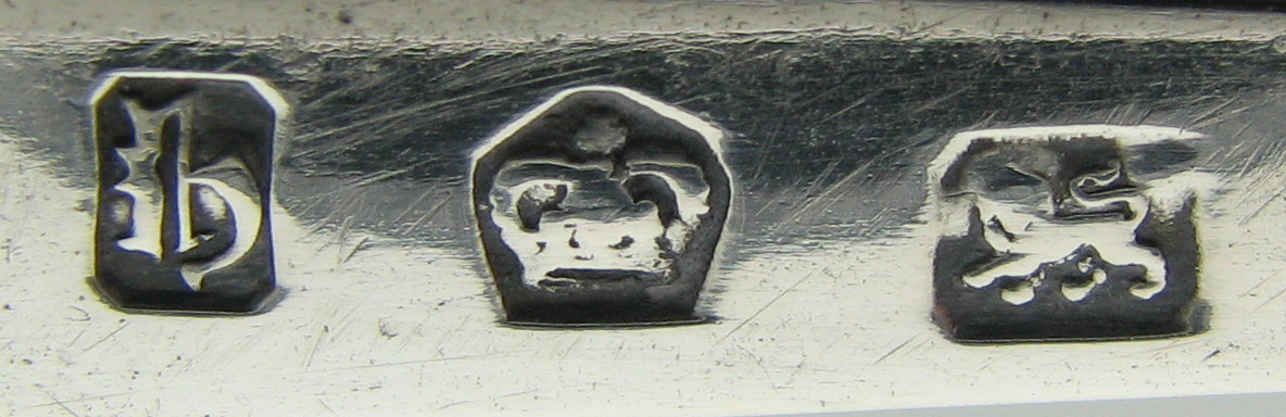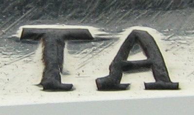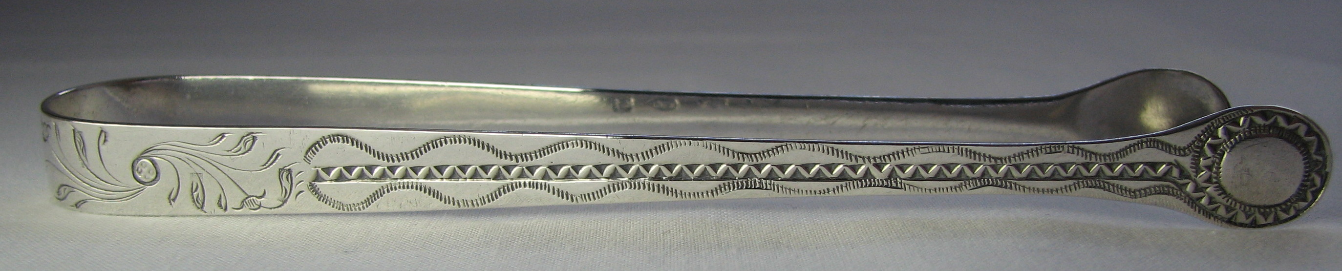 Thomas Allen registered two marks on October 23rd 1777 as a Plate-worker. One was incuse and one standard. These tongs are superb quality bright cut tongs and are dated 1777, when he registered his mark. They have lovely clear marks. Click on a picture to see more details |